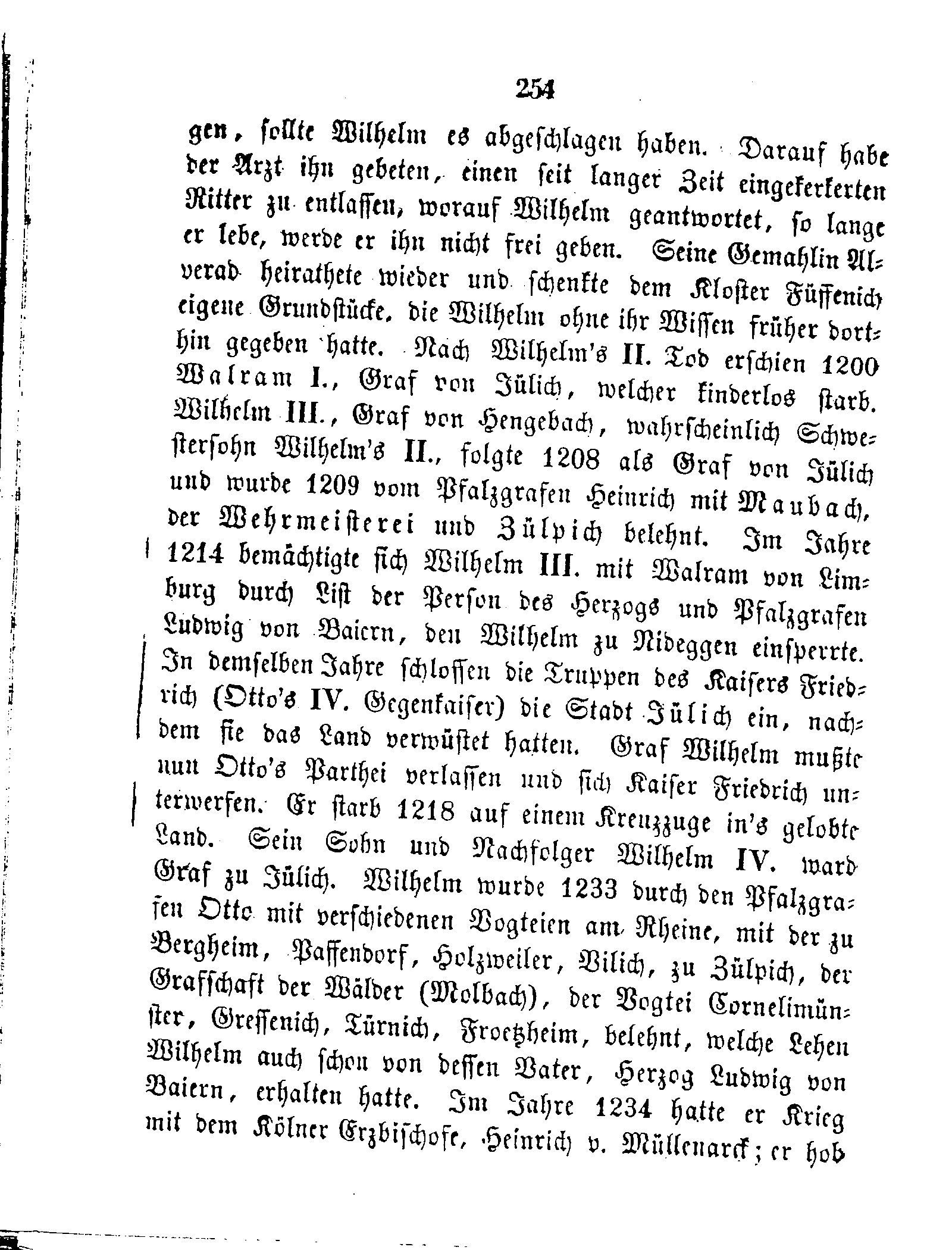 sollte Wilhelm es abgeschlagen haben. Darauf habe der Arzt ihn gebeten, einen seit langer Zeit eingekerkerten Ritter zu entlassen, worauf Wilhelm geantwortet, so lange er lebe, werde er ihn nicht frei geben. Seine Gemahlin Alverad heirathete wieder und schenkte dem Kloster Füssenich eigene Grundstücke, die Wilhelm ohne ihr Wissen früher dorthin gegeben hatte. Nach Wilhelm's II. Tod erschien 1200 Walram I., Graf von Jülich, welcher kinderlos starb. Wilhelm III., Graf von Hengebach, wahrscheinlich Schwestersohn Wilhelm's II., folgte 1208 als Graf von Jülich und wurde 1209 vom Pfalzgrafen Heinrich mit Maubach, der Wehrmeisterei und Zülpich belehnt. Im Jahre 1214 bemächtigte sich Wilhelm III. mit Walram von Limburg durch List der Person des Herzogs und Pfalzgrafen Ludwig von Baiern, den Wilhelm zu Nideggen einsperrte. In demselben Jahre schlossen die Truppen des Kaisers Friedrich (Otto's IV. Gegenkaiser) die Stadt Jülich ein, nachdem sie das Land verwüstet hatten. Graf Wilhelm mußte nun Otto's Parthei verlassen und sich Kaiser Friedrich unterwerfen. Er starb 1218 auf einem Kreuzzuge in's gelobte Land. Sein Sohn und Nachfolger Wilhelm IV. ward Graf zu Jülich. Wilhelm wurde 1233 durch den Pfalzgrafen Otto mit verschiedenen Vogteien am Rheine, mit der zu Bergheim, Paffendorf, Holzweiler, Vilich, zu Zülpich, der Grafschaft der Wälder (Molbach), der Vogtei Cornelimünster, Gressenich, Türnich, Froetzheim, belehnt, welche Lehen Wilhelm auch schon von dessen Vater, Herzog Ludwig von Baiern, erhalten hatte. Im Jahre 1234 hatte er Krieg mit dem Kölner Erzbischofe, Heinrich v. Müllenarck; er hob