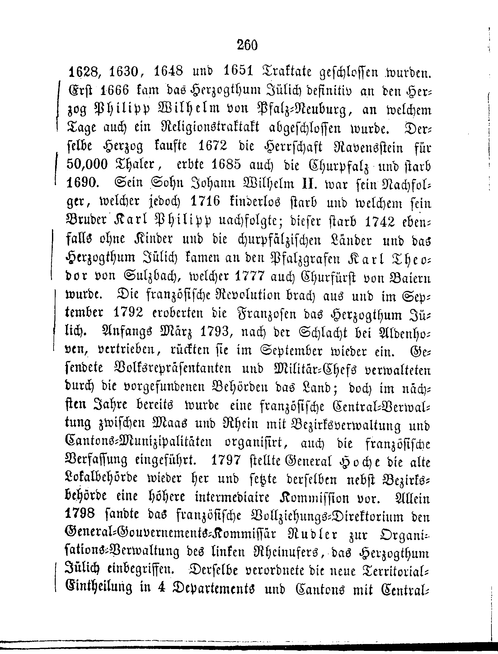 1628, 1630, 1648 und 1651 Traktate geschlossen wurden. Erst 1666 kam das Herzogthum Jülich definitiv an den Herzog Philipp Wilhelm von Pfalz-Neuburg, an welchem Tage auch ein Religionstraktakt abgeschlossen wurde. Derselbe Herzog kaufte 1672 die Herrschaft Ravensstein für 50,000 Thaler, erbte 1685 auch die Churpfalz und starb 1690. Sein Sohn Johann Wilhelm II. war sein Nachfolger, welcher jedoch 1716 kinderlos starb und welchem sein Bruder Karl Philipp nachfolgte; dieser starb 1742 ebenfalls ohne Kinder und die churpfälzischen Länder und das Herzogthum Jülich kamen an den Pfalzgrafen Karl Theodor von Sulzbach, welcher 1777 auch Churfürst von Baiern wurde. Die französische Revolution brach aus und im September 1792 eroberten die Franzosen das Herzogthum Jülich. Anfangs März 1793, nach der Schlacht bei Aldenhoven, vertrieben, rückten sie im September wieder ein. Gesendete Volksrepräsentanten und Militär-Chefs verwalteten durch die vorgefundenen Behörden das Land; doch im nächsten Jahre bereits wurde eine französische Central-Verwaltung zwischen Maas und Rhein mit Bezirksverwaltung und Cantons-Munizipalitäten organisirt, auch die französische Verfassung eingeführt. 1797 stellte General Hoche die alte Lokalbehörde wieder her und setzte derselben nebst Bezirksbehörde eine höhere intermediaire Kommission vor. Allein 1798 sandte das französische Vollziehungs-Direktorium den General-Gouvernements-Kommissär Nudler zur Organisations-Verwaltung des linken Rheinufers, das Herzogthum Jülich einbegriffen. Derselbe verordnete die neue Territorial-Eintheilung in 4 Departements und Cantons mit Central-Verwaltungen