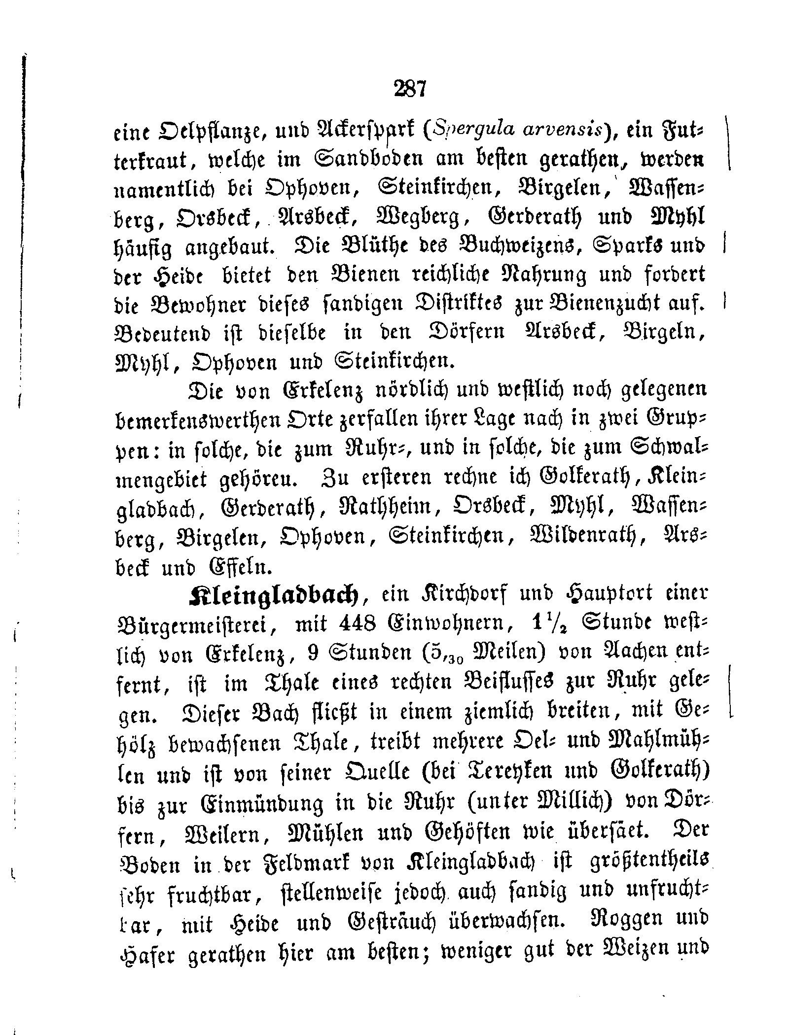 Die von Erkelenz nördlich und westlich noch gelegenen bemerkenswerthen Orte zerfallen ihrer Lage nach in zwei Gruppen: in solche, die zum Ruhr-, und in solche, die zum Schwalmengebiet gehören. Zu ersteren rechne ich Golkerath, Kleingladbach, Gerderath, Rathheim, Orsbeck, Myhl, Wassenberg, Birgelen, Ophoven, Steinkirchen, Wildenrath, Arsbeck und Effeln.