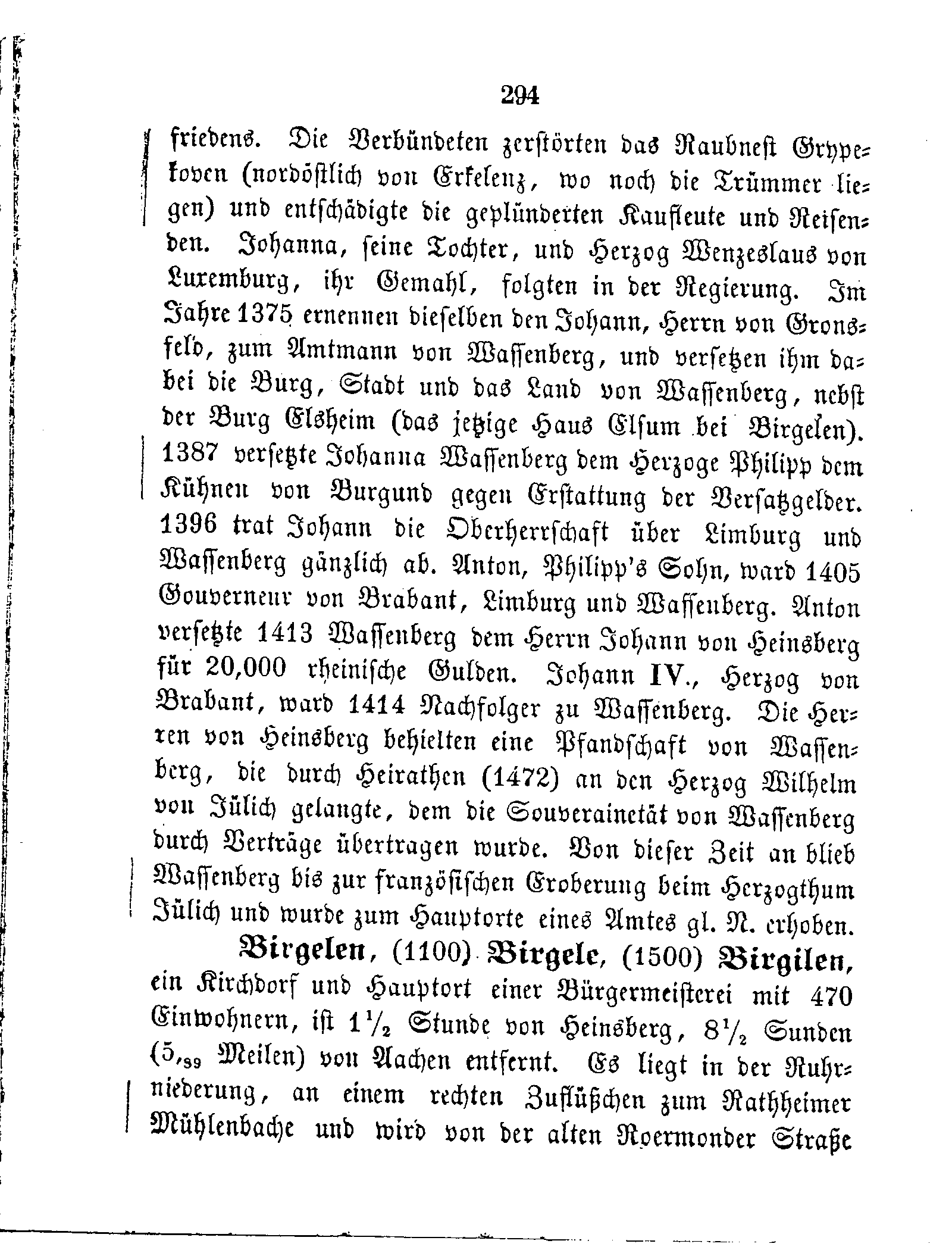 Die Verbündeten zerstörten das Raubnest Grypekoven (nordöstlich von Erkelenz, wo noch die Trümmer liegen) und entschädigte die geplünderten Kaufleute und Reisenden. Johanna, seine Tochter, und Herzog Wenzeslaus von Luxemburg, ihr Gemahl, folgten in der Regierung. Im Jahre 1375 ernennen dieselben den Johann, Herrn von Gronsfeld, zum Amtmann von Wassenberg, und versetzen ihm dabei die Burg, Stadt und das Land von Wassenberg, nebst der Burg Elsheim (das jetzige Haus Elsum bei Birgelen). 1387 versetzte Johanna Wassenberg dem Herzoge Philipp dem Kühnen von Burgund gegen Erstattung der Versatzgelder. 1396 trat Johann die Oberherrschaft über Limburg und Wassenberg gänzlich ab. Anton, Philipp's Sohn, ward 1405 Gouverneur von Brabant, Limburg und Wassenberg. Anton versetzte 1413 Wassenberg dem Herrn Johann von Heinsberg für 20,000 rheinische Gulden. Johann IV., Herzog von Brabant, ward 1414 Nachfolger zu Wassenberg. Die Herren von Heinsberg behielten eine Pfandschaft von Wassenberg, die durch Heirathen (1472) an den Herzog Wilhelm von Jülich gelangte, dem die Souverainität von Wassenberg durch Verträge übertragen wurde. Von dieser Zeit an blieb Wassenberg bis zur französischen Eroberung beim Herzogthum Jülich und wurde zum Hauptorte eines Amtes gl. N. Erhoben.