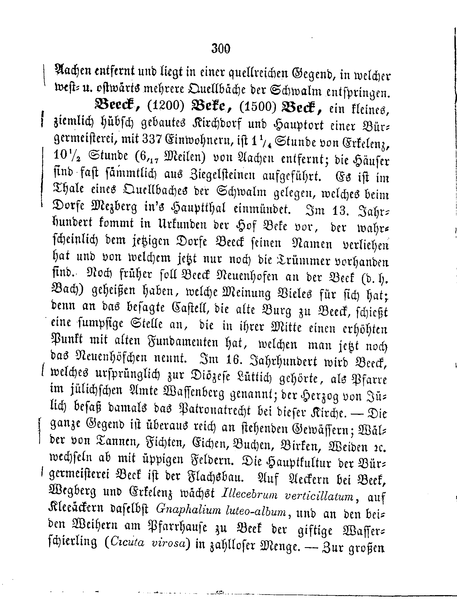 Beeck, (1200) Beke, (1500) Beck, ein kleines, ziemlich hübsch gebautes Kirchdorf und Hauptort einer Bürgermeisterei, mit 337 Einwohnern, ist 1¼ Stunde von Erkelenz, 10½ Stunde (6,17 Meilen) von Aachen entfernt; die Häuser sind fast sämmtlich aus Ziegelsteinen aufgeführt. Es ist im Thale eines Quellbaches der Schwalm gelegen, welches beim Dorfe Mezberg in's Hauptthal einmündet. Im 13. Jahrhundert kommt in Urkunden der Hof Beke vor, der wahrscheinlich dem jetzigen Dorfe Beeck seinen Namen verliehen hat und von welchem jetzt nur noch die Trümmer vorhanden sind. Noch früher soll Beeck Neuenhofen an der Beck (d. h. Bach) geheißen haben, welche Meinung Vieles für sich hat; denn an das besagte Castell, die alte Burg zu Beeck, schießt eine sumpfige Stelle an, die in ihrer Mitte einen erhöhten Punkt mit alten Fundamenten hat, welchen man jetzt noch das Neuenhöfchen nennt. Im 16. Jahrhundert wird Beeck, welches ursprünglich zur Diözese Lüttich gehörte, als Pfarre im jülichschen Amte Wassenberg genannt; der Herzog von Jülich besaß damals das Patronatrecht bei dieser Kirche. — Die ganze Gegend ist überaus reich an stehenden Gewässern; Wälder von Tannen, Fichten, Eichen, Buchen, Birken, Weiden ec. wechseln ab mit üppigen Feldern. Die Hauptkultur der Bürgermeisterei Beek ist der Flachsbau. Auf Aeckern bei Beek, Wegberg und Erkelenz wächst Illecebrum verticillatum, auf Kleeäckern daselbst Gnaphalium luteo-album, und an den beiden Weihern am Pfarrhause zu Beek der giftige Wasserschierling (Cicuta virosa) in zahlloser Menge. — Zur großen