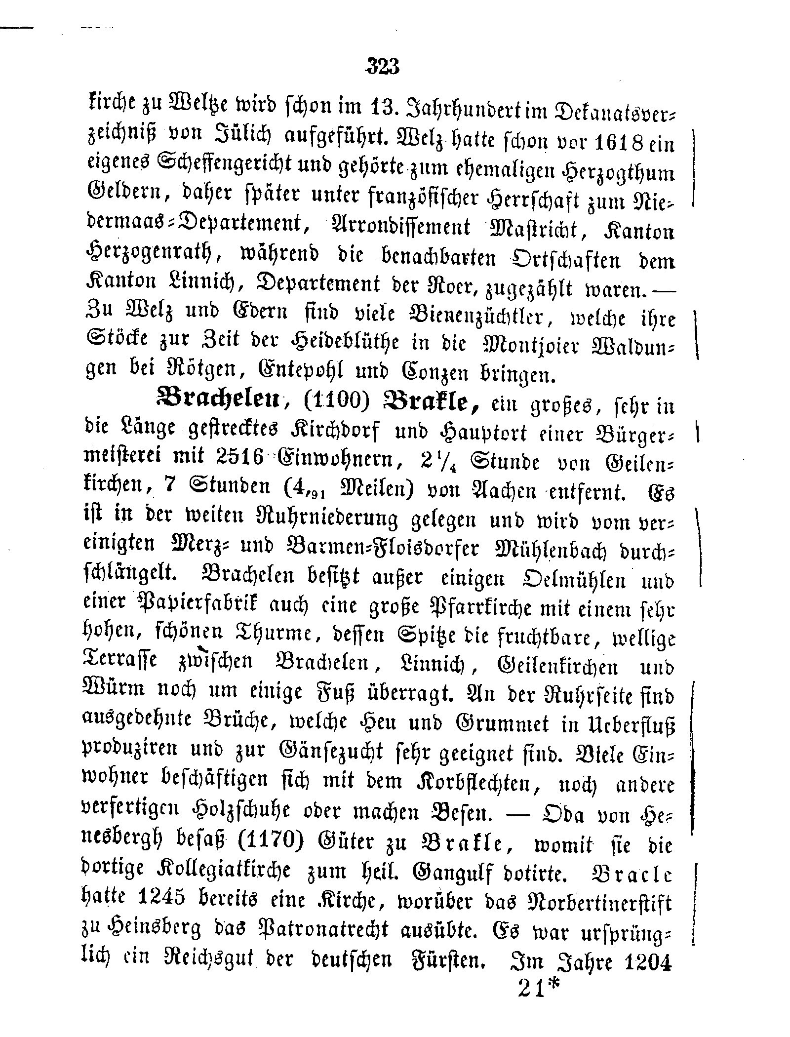 Brachelen, (1100) Brakle, ein großes, sehr in die Länge gestrecktes Kirchdorf und Hauptort einer Bürgermeisterei mit 2516 Einwohnern, 2¼ Stunde von Geilenkirchen, 7 Stunden (4,91 Meilen) von Aachen entfernt. Es ist in der weiten Ruhrniederung gelegen und wird vom vereinigten Merz- und Barmen-Floisdorfer Mühlenbach durchschlängelt. Brachelen besitzt außer einigen Oelmühlen und einer Papierfabrik auch eine große Pfarrkirche mit einem sehr hohen, schönen Thurme, dessen Spitze die fruchtbare, wellige Terrasse zwischen Brachelen, Linnich, Geilenkirchen und Würm noch um einige Fuß überragt. An der Ruhrseite sind ausgedehnte Brüche, welche Heu und Grummet in Ueberfluß produziren und zur Gänsezucht sehr geeignet sind. Viele Einwohner beschäftigen sich mit dem Korbflechten, noch andere verfertigen Holzschuhe oder machen Besen. — Oda von Henesbergh besaß (1170) Güter zu Brakle, womit sie die dortige Kollegiatkirche zum heil. Gangulf dotirte. Bracle hatte 1245 bereits eine Kirche, worüber das Norbertinerstift zu Heinsberg das Patronatrecht ausübte. Es war ursprünglich ein Reichsgut der deutschen Fürsten. Im Jahre 1204