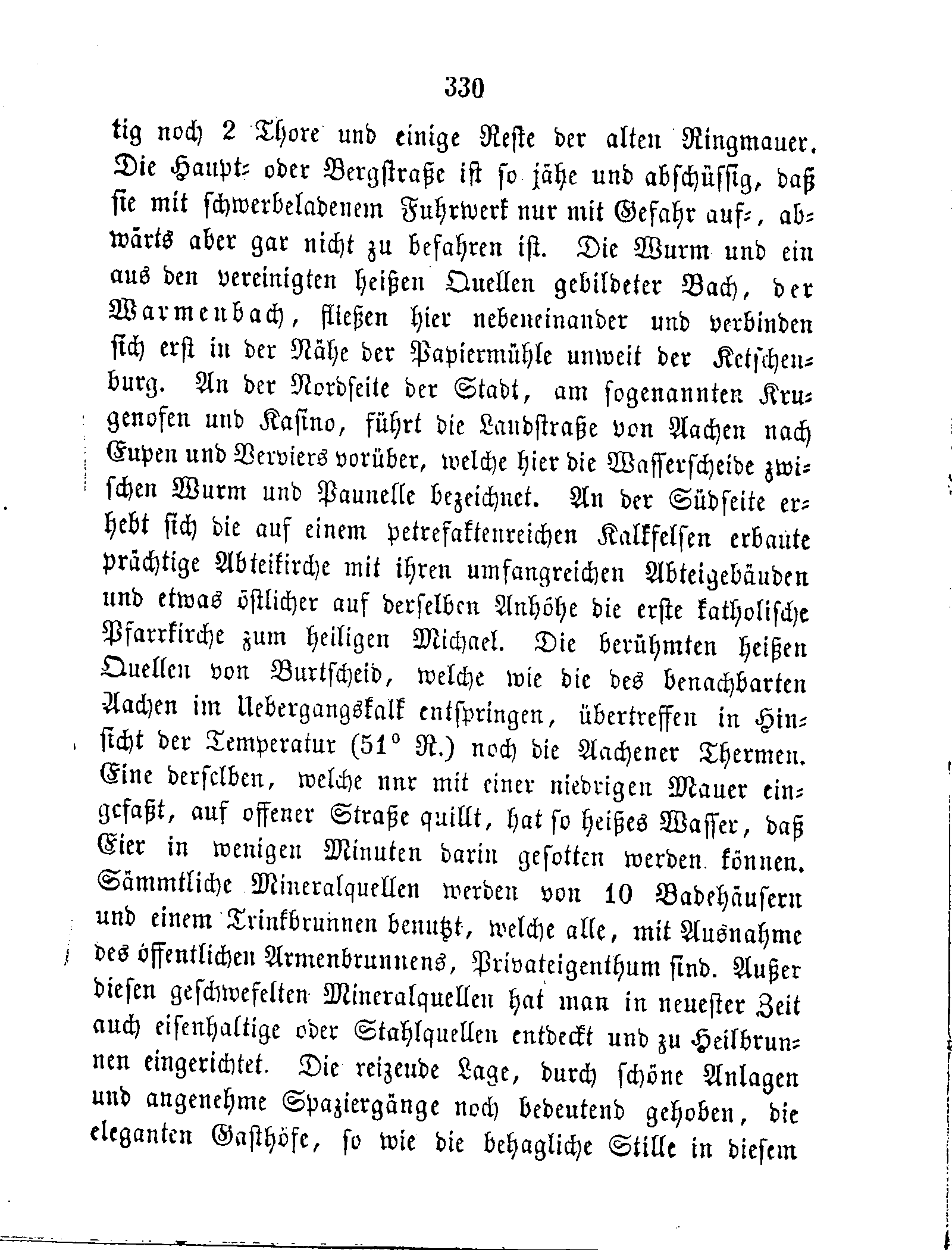 noch 2 Thore und einige Reste der alten Ringmauer. Die Haupt- oder Bergstraße ist so jähe und abschüssig, daß sie mit schwerbeladenem Fuhrwerk nur mit Gefahr auf-, abwärts aber gar nicht zu befahren ist. Die Wurm und ein aus den vereinigten heißen Quellen gebildeter Bach, der Warmenbach, fließen hier nebeneinander und verbinden sich erst in der Nähe der Papiermühle unweit der Ketschenburg. An der Nordseite der Stadt, am sogenannten Krugenofen und Kasino, führt die Landstraße von Aachen nach Eupen und Verviers vorüber, welche hier die Wasserscheide zwischen Wurm und Paunelle bezeichnet. An der Südseite erhebt sich die auf einem petrefaktenreichen Kalkfelsen erbaute prächtige Abteikirche mit ihren umfangreichen Abteigebäuden und etwas östlicher auf derselben Anhöhe die erste katholische Pfarrkirche zum heiligen Michael. Die berühmten heißen Quellen von Burtscheid, welche wie die des benachbarten Aachen im Uebergangskalk entspringen, übertreffen in Hinsicht der Temperatur (51° R.) noch die Aachener Thermen. Eine derselben, welche nur mit einer niedrigen Mauer eingefaßt, auf offener Straße quillt, hat so heißes Wasser, daß Eier in wenigen Minuten darin gesotten werden können. Sämmtliche Mineralquellen werden von 10 Badehäusern und einem Trinkbrunnen benutzt, welche alle, mit Ausnahme des öffentlichen Armenbrunnens, Privateigenthum sind. Außer diesen geschwefelten Mineralquellen hat man in neuester Zeit auch eisenhaltige oder Stahlquellen entdeckt und zu Heilbrunnen eingerichtet. Die reizende Lage, durch schöne Anlagen und angenehme Spaziergänge noch bedeutend gehoben, die eleganten Gasthöfe, so wie die behagliche Stille in diesem