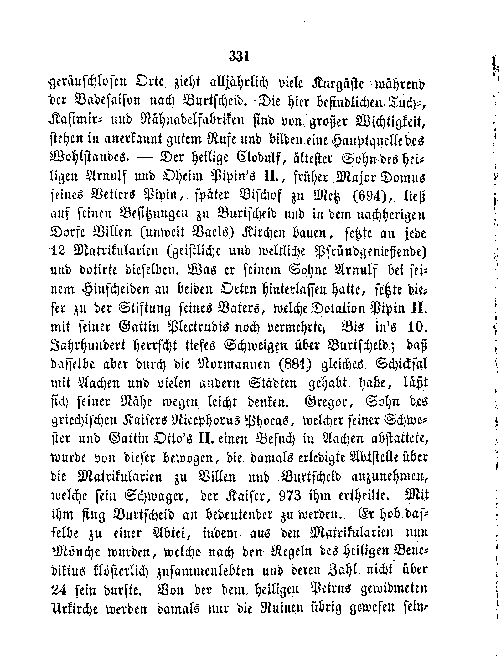geräuschlosen Orte zieht alljährlich viele Kurgäste während der Badesaison nach Burtscheid. Die hier befindlichen Tuch-, Kasimir- und Nähnadelfabriken sind von großer Wichtigkeit, stehen in anerkannt gutem Rufe und bilden eine Hauptquelle des Wohlstandes. — Der heilige Clodulf, ältester Sohn des heiligen Arnulf und Oheim Pipin's II., früher Major Domus seines Vetters Pipin, später Bischof zu Metz (694), ließ auf seinen Besitzungen zu Burtscheid und in dem nachherigen Dorfe Villen (unweit Vaels) Kirchen bauen, setzte an jede 12 Matrikularien (geistliche und weltliche Pfründgenießende) und dotirte dieselben. Was er seinem Sohne Arnulf bei seinem Hinscheiden an beiden Orten hinterlassen hatte, setzte dieser zu der Stiftung seines Vaters, welche Dotation Pippin II. mit seiner Gattin Plectrudis noch vermehrte. Bis in's 10. Jahrhundert herrscht tiefes Schweigen über Burtscheid; daß dasselbe aber durch die Normannen (881) gleiches Schicksal mit Aachen und vielen andern Städten gehabt habe, läßt sich seiner Nähe wegen leicht denken. Gregor, Sohn des griechischen Kaisers Nicephorus Phocas, welcher seiner Schwester und Gattin Otto's II. einen Besuch in Aachen abstattete, wurde von dieser bewogen, die damals erledigte Abtstelle über die Matrikularien zu Villen und Burtscheld anzunehmen, welche sein Schwager, der Kaiser, 973 ihm ertheilte. Mit ihm fing Burtscheid an bedeutender zu werden. Er hob dasselbe zu einer Abtei, indem aus den Matrikularien nun Mönche wurden, welche nach den Regeln des heiligen Benediktus klösterlich zusammenlebten und deren Zahl nicht über 24 sein durfte. Von der dem heiligen Petrus gewidmeten Urkirche werden damals nur die Ruinen übrig gewesen sein,