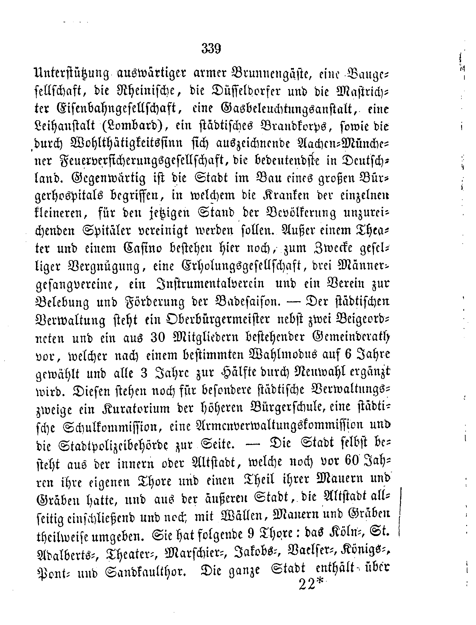 Unterstützung auswärtiger armer Brunnengäste, eine Baugesellschaft, die Rheinische, die Düsseldorfer und die Mastrichter Eisenbahngesellschaft, eine Gasbeleuchtungsanstalt, eine Leihanstalt (Lombard), ein städtisches Brandkorps, sowie die durch Wohlthätigkeitssinn sich auszeichnende Aachen-Münchener Feuerversicherungsgesellschaft, die bedeutendste in Deutschland. Gegenwärtig ist die Stadt im Bau eines großen Bürgerhospitals begriffen, in welchem die Kranken der einzelnen kleineren, für den jetzigen Stand der Bevölkerung unzureichenden Spitäler vereinigt werden sollen. Außer einem Theater und einem Casino bestehen hier noch, zum Zwecke geselliger Vergnügung, eine Erholungsgesellschaft, drei Männergesangvereine, ein Instrumentalverein und ein Verein zur Belebung und Förderung der Badesaison. — Der städtischen Verwaltung steht ein Oberbürgermeister nebst zwei Beigeordneten und ein aus 30 Mitgliedern bestehender Gemeinderath vor, welcher nach einem bestimmten Wahlmodus auf 6 Jahre gewählt und alle 3 Jahre zur Hälfte durch Neuwahl ergänzt wird. Diesen stehen noch für besondere städtische Verwaltungszweige ein Kuratorium der höheren Bürgerschule, eine städtische Schulkommission, eine Armenverwaltungskommission und die Stadtpolizeibehörde zur Seite. — Die Stadt selbst besteht aus der innern oder Altstadt, welche noch vor 60 Jahren ihre eigenen Thore und einen Theil ihrer Mauern und Gräben hatte, und aus der äußeren Stadt, die Altstadt allseitig einschließend und noch mit Wällen, Mauern und Gräben teilweise umgeben. Sie hat folgende 9 Thore: das Köln-, St. Adalberts-, Theater-, Marschier-, Jakobs-, Vaelser-, Königs-, Pont- und Sandkaulthor. Die ganze Stadt enthält über