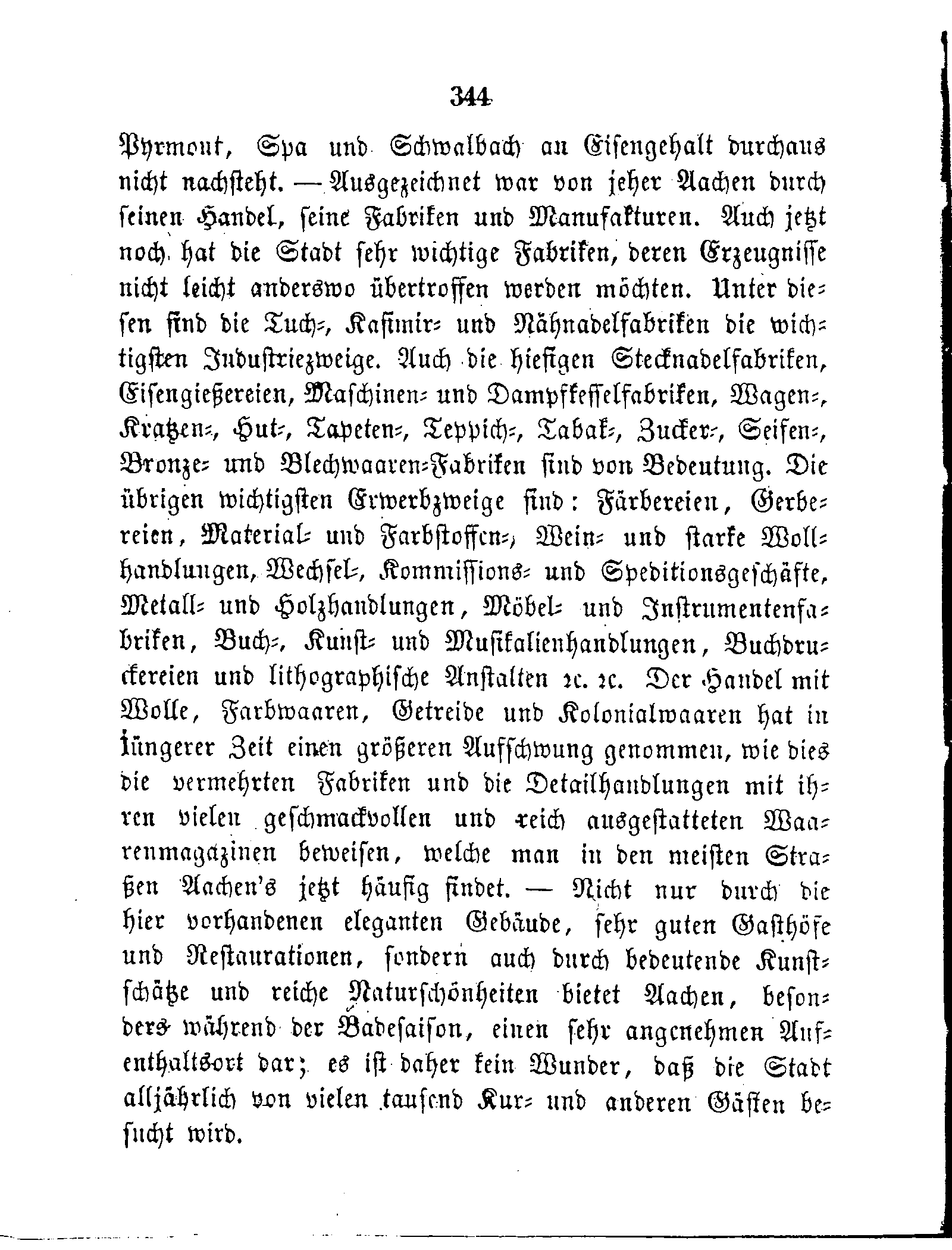 Pyrmont, Spa und Schwalbach an Eisengehalt durchaus nicht nachsteht. — Ausgezeichnet war von jeher Aachen durch seinen Handel, seine Fabriken und Manufakturen. Auch jetzt noch hat die Stadt sehr wichtige Fabriken, deren Erzeugnisse nicht leicht anderswo übertroffen werden möchten. Unter diesen sind die Tuch-, Kasimir- und Nähnadelfabriken die wichtigsten Industriezweige. Auch die hiesigen Stecknadelfabriken, Eisengießereien, Maschinen- und Dampfkesselfabriken, Wagen-, Kratzen-, Hut-, Tapeten-, Teppich-, Tabak-, Zucker-, Seifen-, Bronze- und Blechwaaren-Fabriken sind von Bedeutung. Die übrigen wichtigsten Erwerbzweige sind: Färbereien, Gerbereien, Material- und Farbstoffen-, Wein- und starke Wollhandlungen, Wechsel-, Kommissions- und Speditionsgeschäfte, Metall- und Holzhandlungen, Möbel- und Instrumentenfabriken, Buch-, Kunst- und Musikalienhandlungen, Buchdruckereien und lithographische Anstalten ec. ec. Der Handel mit Wolle, Farbwaaren, Getreide und Kolonialwaaren hat in jüngerer Zeit einen größeren Aufschwung genommen, wie dies die vermehrten Fabriken und die Detailhandlungen mit ihren vielen geschmackvollen und reich ausgestatteten Waarenmagazinen beweisen, welche man in den meisten Straßen Aachen's jetzt häufig findet. — Nicht nur durch die hier vorhandenen eleganten Gebäude, sehr guten Gasthöfe und Restaurationen, sondern auch durch bedeutende Kunstschätze und reiche Naturschönheiten bietet Aachen, besonders während der Badesaison, einen sehr angenehmen Aufenthaltsort dar; es ist daher kein Wunder, daß die Stadt alljährlich von vielen tausend Kur- und anderen Gästen besucht wird.