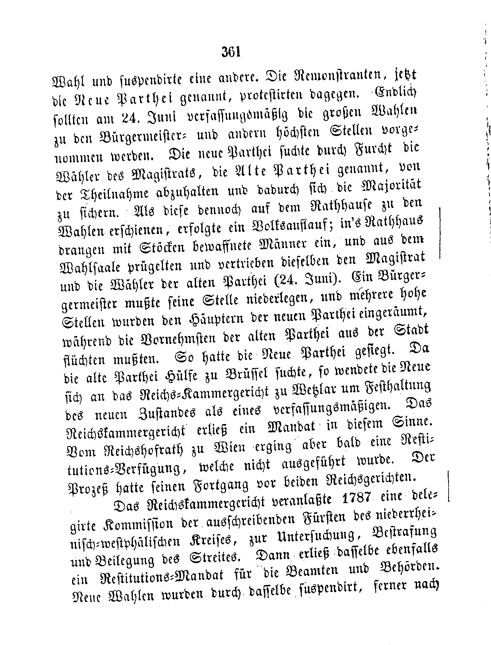 Wahl und suspendirte eine andere. Die Remonstranten, jetzt die Neue Parthei genannt, protestirten dagegen. Endlich sollten am 24. Juni verfassungsmäßig die großen Wahlen zu den Bürgermeister- und andern höchsten Stellen vorgenommen werden. Die neue Parthei suchte durch Furcht die Wähler des Magistrats, die Alte Parthei genannt, von der Theilnahme abzuhalten und dadurch sich die Majorität zu sichern. Als diese dennoch auf dem Rathhause zu den Wahlen erschienen, erfolgte ein Volksauflauf; in's Rathhaus drangen mit Stöcken bewaffnete Männer ein, und aus dem Wahlsaale prügelten und vertrieben dieselben den Magistrat und die Wähler der alten Parthei (24. Juni). Ein Bürgergermeister mußte seine Stelle niederlegen, und mehrere hohe Stellen wurden den Häuptern der neuen Parthei eingeräumt, während die Vornehmsten der alten Parthei aus der Stadt flüchten mußten. So hatte die Neue Parthei gesiegt. Da die alte Parthei Hülfe zu Brüssel suchte, so wendete die Neue sich an das Reichs-Kammergericht zu Wetzlar um Festhaltung des neuen Zustandes als eines verfassungsmäßigen. Das Reichskammergericht erließ ein Mandat in diesem Sinne. Vom Reichshofrath zu Wien erging aber bald eine Restitutions-Verfügung, welche nicht ausgeführt wurde. Der Prozeß hatte seinen Fortgang vor beiden Reichsgerichten.
