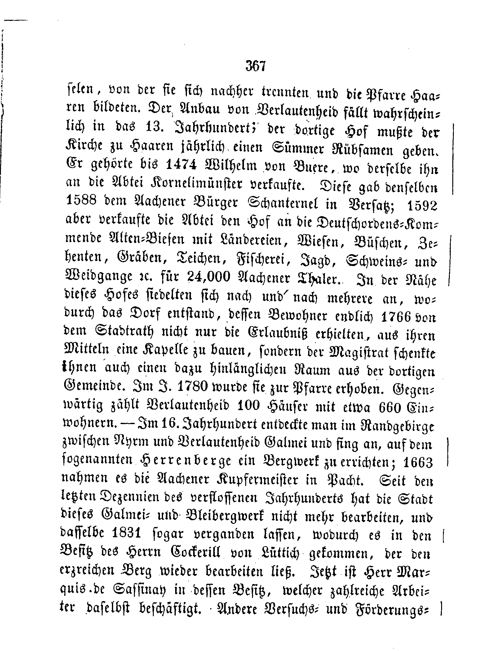 von der sie sich nachher trennten und die Pfarre Haaren bildeten. Der Anbau von Verlautenheid fällt wahrscheinlich in das 13. Jahrhundert, der dortige Hof mußte der Kirche zu Haaren jährlich einen Sümmer[1] Rübsamen geben. Er gehörte bis 1474 Wilhelm von Buere, wo derselbe ihn an die Abtei Kornelimünster verkaufte. Diese gab denselben 1588 dem Aachener Bürger Schanternel in Versatz; 1592 aber verkaufte die Abtei den Hof an die Deutschordens-Kommende Alten-Biesen mit Ländereien, Wiesen, Büschen, Zehenten, Gräben, Teichen, Fischerei, Jagd, Schweins- und Weidgange ec. für 24,000 Aachener Thaler. In der Nähe dieses Hofes siedelten sich nach und nach mehrere an, wodurch das Dorf entstand, dessen Bewohner endlich 1766 von dem Stadtrath nicht nur die Erlaubniß erhielten, aus ihren Mitteln eine Kapelle zu bauen, sondern der Magistrat schenkte ihnen auch einen dazu hinlänglichen Raum aus der dortigen Gemeinde. Im J. 1780 wurde sie zur Pfarre erhoben. Gegenwärtig zählt Verlautenheid 100 Häuser mit etwa 660 Einwohnern.— Im 16. Jahrhundert entdeckte man im Randgebirge zwischen Nyrm und Verlautenheid Galmei und fing an, auf dem sogenannten Herrenberge ein Bergwerk zu errichten; 1663 nahmen es die Aachener Kupfermeister in Pacht. Seit den letzten Dezennien des verflossenen Jahrhunderts hat die Stadt dieses Galmei- und Bleibergwerk nicht mehr bearbeiten, und dasselbe 1831 sogar verganden lassen, wodurch es in den Besitz des Herrn Cockerill von Lüttich gekommen, der den erzreichen Berg wieder bearbeiten ließ. Jetzt ist Herr Marquis de Sassinay in dessen Besitz, welcher zahlreiche Arbeiter daselbst beschäftigt. Andere Versuchs- und Förderungsschachte