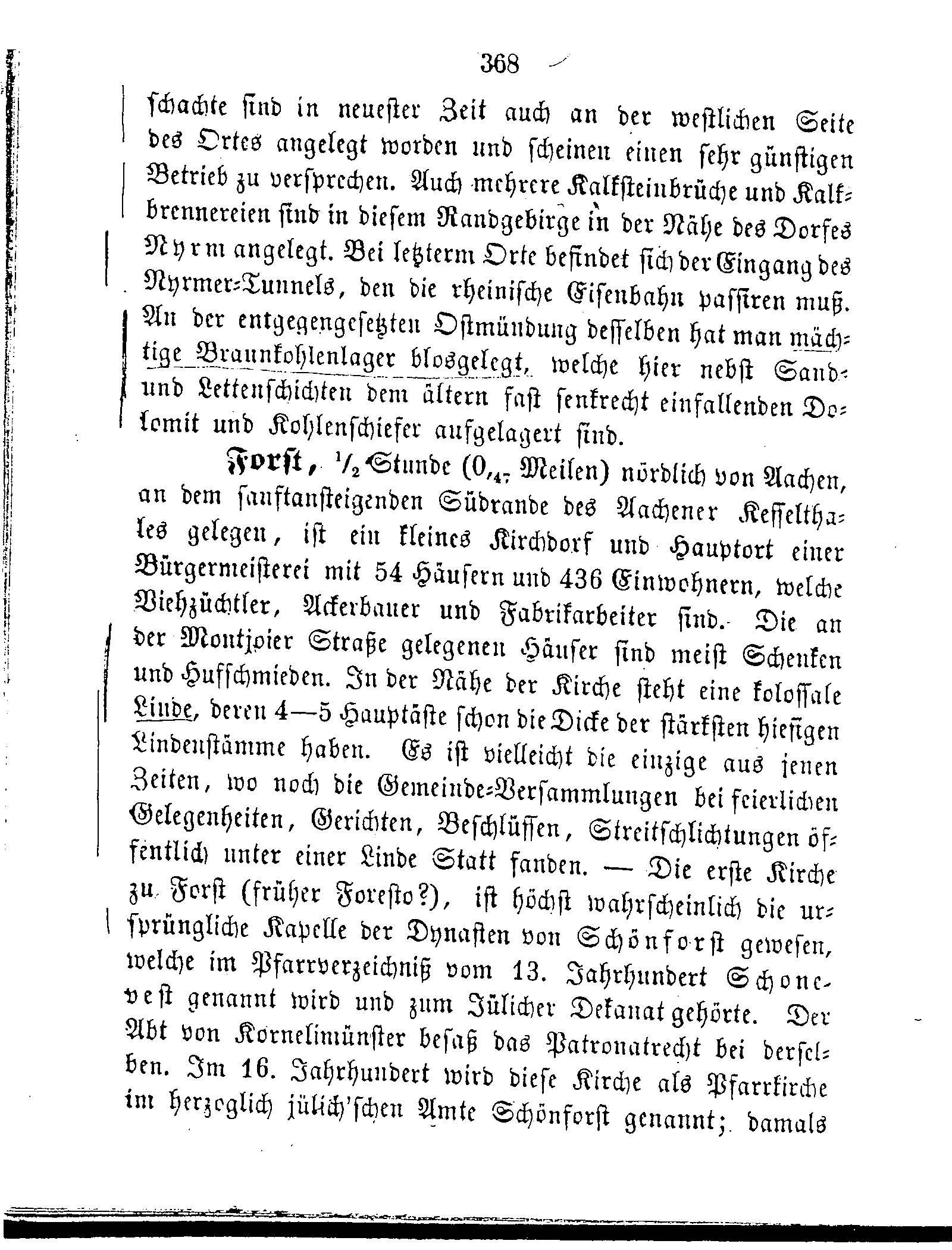 Forst, ½ Stunde (0,47</sub.> Meilen) nördlich von Aachen, an dem sanftansteigenden Südrande des Aachener Kesselthales gelegen, ist ein kleines Kirchdorf und Hauptort einer Bürgermeisterei mit 54 Häusern und 436 Einwohnern, welche Viehzüchtler, Ackerbauer und Fabrikarbeiter sind. Die an der Montjoier Straße gelegenen Häuser sind meist Schenken und Hufschmieden. In der Nähe der Kirche steht eine kolossale Linde, deren 4-5 Hauptäste schon die Dicke der stärksten hiesigen Lindenstämme haben. Es ist vielleicht die einzige aus jenen Zeiten, wo noch die Gemeinde-Versammlungen bei feierlichen Gelegenheiten, Gerichten, Beschlüssen, Streitschlichtungen öffentlich unter einer Linde Statt fanden. — Die erste Kirche zu Forst (früher Foresto?), ist höchst wahrscheinlich die ursprüngliche Kapelle der Dynasten von Schönforst gewesen, welche im Pfarrverzeichniß vom 13. Jahrhundert Schonevest genannt wird und zum Jülicher Dekanat gehörte. Der Abt von Kornelimünster besaß das Patronatrecht bei derselben. Im 16. Jahrhundert wird diese Kirche als Pfarrkirche im herzoglich jülich'schen Amte Schönforst genannt; damals