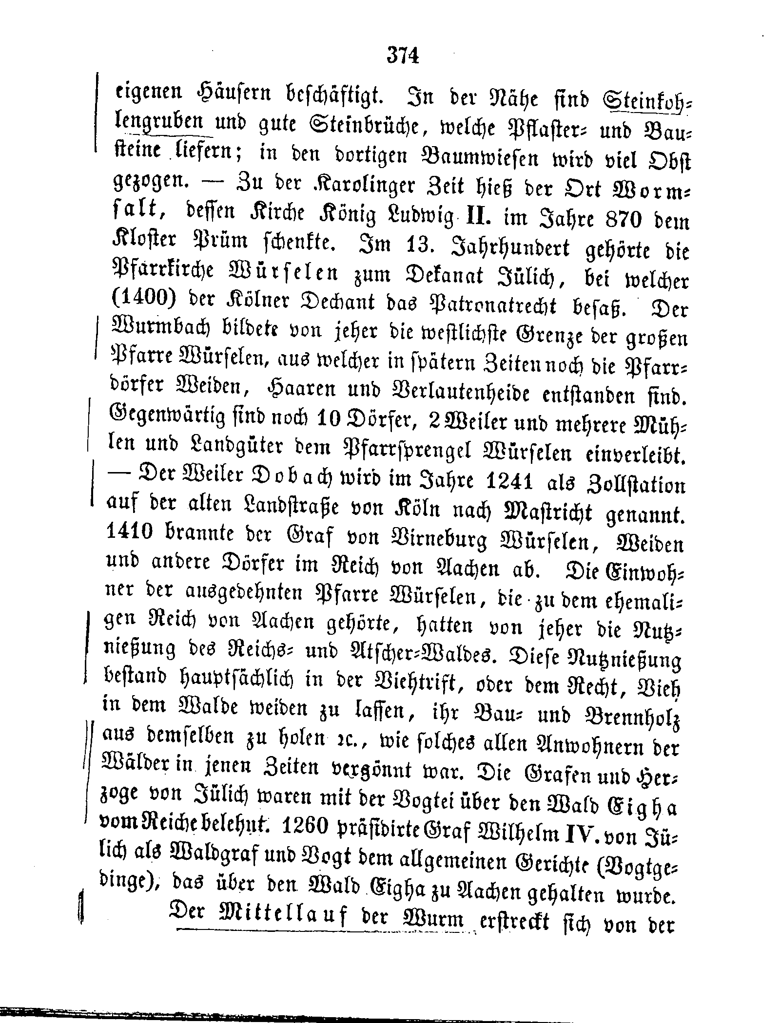 eigenen Häusern beschäftigt. In der Nähe sind Steinkohlengruben und gute Steinbrüche, welche Pflaster- und Bausteine liefern; in den dortigen Baumwiesen wird viel Obst gezogen. — Zu der Karolinger Zeit hieß der Ort Wormsalt, dessen Kirche König Ludwig II. im Jahre 870 dem Kloster Prüm schenkte. Im 13. Jahrhundert gehörte die Pfarrkirche Würselen zum Dekanat Jülich, bei welcher (1400) der Kölner Dechant das Patronatrecht besaß. Der Wurmbach bildete von jeher die westlichste Grenze der großen Pfarre Würselen, aus welcher in spätern Zeiten noch die Pfarrdörfer Weiden, Haaren und Verlautenheide entstanden sind. Gegenwärtig sind noch 10 Dörfer, 2 Weiler und mehrere Mühlen und Landgüter dem Pfarrsprengel Würselen einverleibt. — Der Weiler Dobach wird im Jahre 1241 als Zollstation auf der alten Landstraße von Köln nach Mastricht genannt. 1410 brannte der Graf von Virneburg Würselen, Weiden und andere Dörfer im Reich von Aachen ab. Die Einwohner der ausgedehnten Pfarre Würselen, die zu dem ehemaligen Reich von Aachen gehörte, hatten von jeher die Nutznießung des Reichs- und Atscher-Waldes. Diese Nutznießung bestand hauptsächlich in der Viehtrift, oder dem Recht, Vieh in dem Walde weiden zu lassen, ihr Bau- und Brennholz aus demselben zu holen ec., wie solches allen Anwohnern der Wälder in jenen Zeiten vergönnt war. Die Grafen und Herzoge von Jülich waren mit der Vogtei über den Wald Eigha vom Reiche belehnt. 1260 präsidirte Graf Wilhelm IV. von Jülich als Waldgraf und Vogt dem allgemeinen Gerichte (Vogtgedinge), das über den Wald Eigha zu Aachen gehalten wurde.