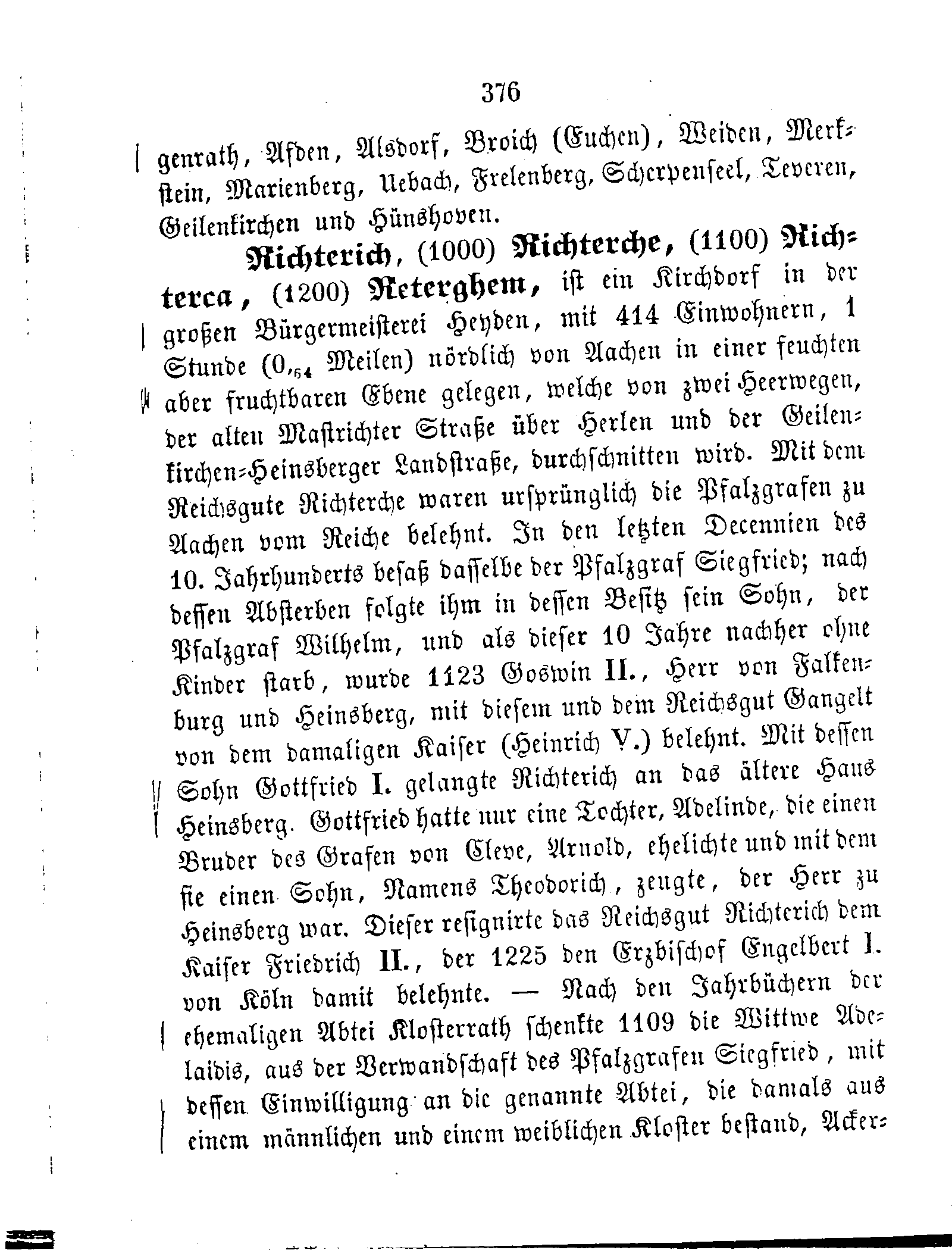 Richterich, (1000) Richterche, (1100) Richterca, (1200) Reterghem, ist ein Kirchdorf in der großen Bürgermeisterei Heyden, mit 414 Einwohnern, 1 Stunde (0,64 Meilen) nördlich von Aachen in einer feuchten aber fruchtbaren Ebene gelegen, welche von zwei Heerwegen, der alten Mastrichter Straße über Herlen und der Geilenkirchen-Heinsberger Landstraße, durchschnitten wird. Mit dem Reichsgute Richterche waren ursprünglich die Pfalzgrafen zu Aachen vom Reiche belehnt. In den letzten Decennien des 10. Jahrhunderts besaß dasselbe der Pfalzgraf Siegfried; nach dessen Absterben folgte ihm in dessen Besitz sein Sohn, der Pfalzgraf Wilhelm, und als dieser 10 Jahre nachher ohne Kinder starb, wurde 1123 Goswin II., Herr von Falkenburg und Heinsberg, mit diesem und dem Reichsgut Gangelt von dem damaligen Kaiser (Heinrich V.) belehnt. Mit dessen Sohn Gottfried I. gelangte Richterich an das ältere Haus Heinsberg. Gottfried hatte nur eine Tochter, Adelinde, die einen Bruder des Grafen von Cleve, Arnold, ehelichte und mit dem sie einen Sohn, Namens Theodorich, zeugte, der Herr zu Heinsberg war. Dieser resignirte das Reichsgut Richterich dem Kaiser Friedrich II., der 1225 den Erzbischof Engelbert I. von Köln damit belehnte. — Nach den Jahrbüchern der ehemaligen Abtei Klosterrath schenkte 1109 die Wittwe Adelaidis, aus der Verwandschaft des Pfalzgrafen Siegfried, mit dessen Einwilligung an die genannte Abtei, die damals aus einem männlichen und einem weiblichen Kloster bestand, Ackerland