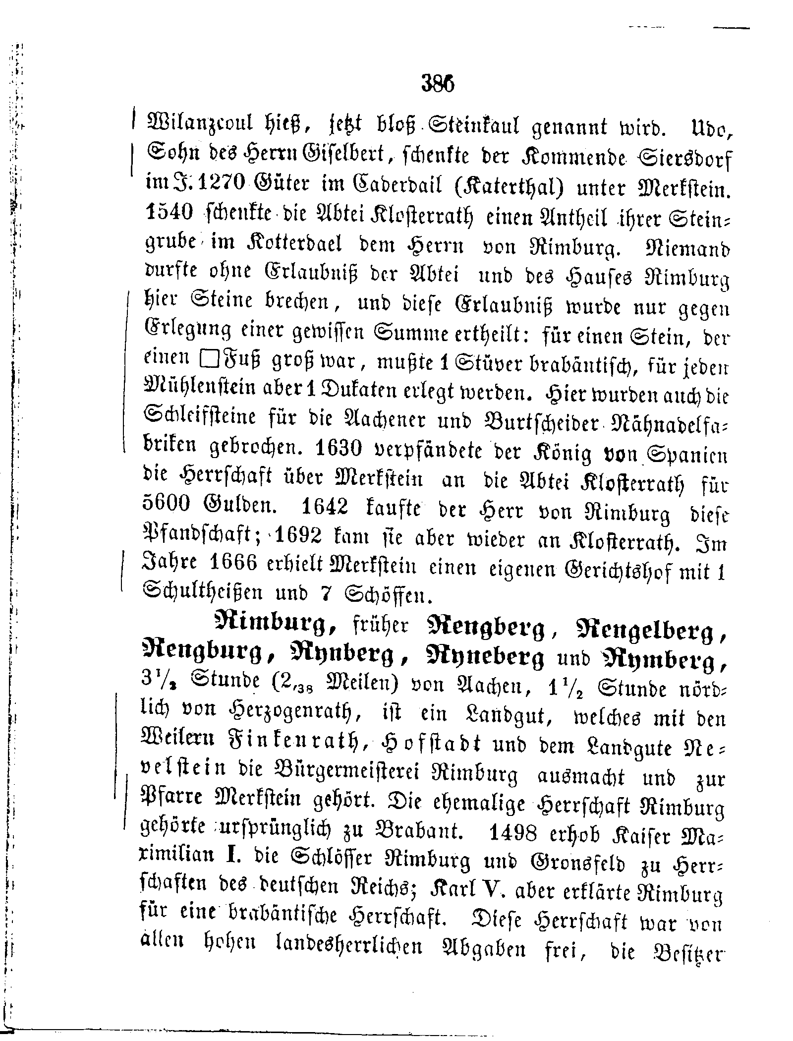 Wilanzcoul hieß, jetzt bloß Steinkaul genannt wird. Udo, Sohn des Herrn Giselbert, schenkte der Kommende Siersdorf im J. 1270 Güter im Caderdail (Katerthal) unter Merkstein. 1540 schenkte die Abtei Klosterrath einen Antheil ihrer Steingrube im Kotterdael dem Herrn von Rimburg. Niemand durfte ohne Erlaubniß der Abtei und des Hauses Rimburg hier Steine brechen, und diese Erlaubniß wurde nur gegen Erlegung einer gewissen Summe ertheilt: für einen Stein, der einen Quadratfuß[1] groß war, mußte 1 Stüver brabäntisch, für jeden Mühlenstein aber 1 Dukaten erlegt werden. Hier wurden auch die Schleifsteine für die Aachener und Burtscheider Nähnadelfabriken gebrochen. 1630 verpfändete der König von Spanien die Herrschaft über Merkstein an die Abtei Klosterrath für 5600 Gulden. 1642 kaufte der Herr von Rimburg diese Pfandschaft; 1692 kam sie aber wieder an Klosterrath. Im Jahre 1666 erhielt Merkstein einen eigenen Gerichtshof mit 1 Schultheißen und 7 Schöffen.
