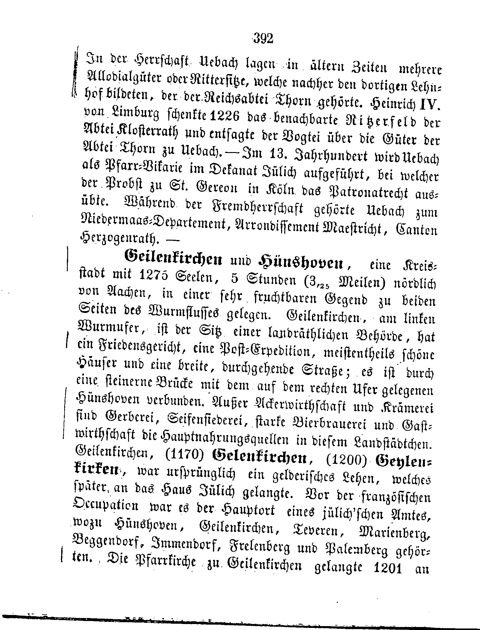 Geilenkirchen und Hünshoven, eine Kreisstadt mit 1275 Seelen, 5 Stunden (3,25 Meilen) nördlich von Aachen, in einer sehr fruchtbaren Gegend zu beiden Seiten des Wurmflusses gelegen. Geilenkirchen, am linken Wurmufer, ist der Sitz einer landräthlichen Behörde, hat ein Friedensgericht, eine Post-Expedition, meistentheils schöne Häuser und eine breite, durchgehende Straße; es ist durch eine steinerne Brücke mit dem auf dem rechten Ufer gelegenen Hünshoven verbunden. Außer Ackerwirthschaft und Krämerei sind Gerberei, Seifensiederei, starke Bierbrauerei und Gastwirthschaft die Hauptnahrungsquellen in diesem Landstädtchen. Geilenkirchen, (1170) Gelenkirchen, (1200) Geylenkirken, war ursprünglich ein gelderisches Lehen, welches später an das Haus Jülich gelangte. Vor der französischen Occupation war es der Hauptort eines jülich'schen Amtes, wozu Hünshoven, Geilenkirchen, Teveren, Marienberg, Beggendorf, Immendorf, Frelenberg und Palemberg gehörten. Die Pfarrkirche zu Geilenkirchen gelangte 1201 an