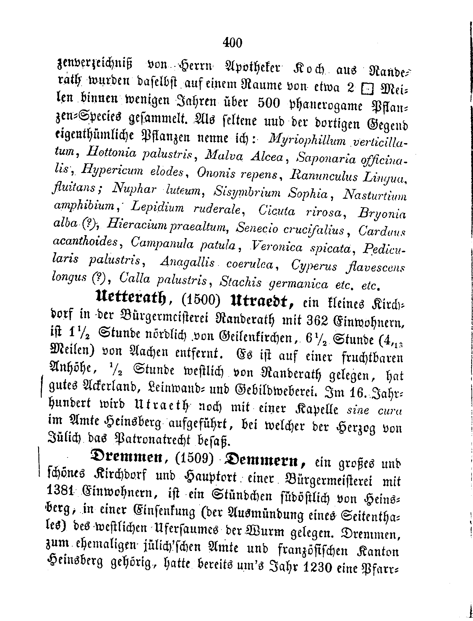 von Herrn Apotheker Koch aus Randerath wurden daselbst auf einem Raume von etwa 2 Quadratmeilen binnen wenigen Jahren über 500 phanerogame Pflanzen-Species gesammelt. Als seltene und der dortigen Gegend eigenthümliche Pflanzen nenne ich: Myriophillum verticillatum, Hottonia palustris, Malva Alcea, Saponaria officinalis, Hypericum elodes, Ononis repens, Ranunculus Lingua, fluitans; Nupar luteum, Sisymbrium Sophia, Nasturtium amphibium, Lepidium ruderale, Cicuta rirosa, Bryonia alba (?), Hieracium praealtum, Senecio crucifalius, Carduus acanthoides, Campanula patula, Veronica spicata, Pedicularis palustris, Anagallis coerulea, Cyperus flavescens longus (?), Calla palustris, Stachis germanica etc. etc.