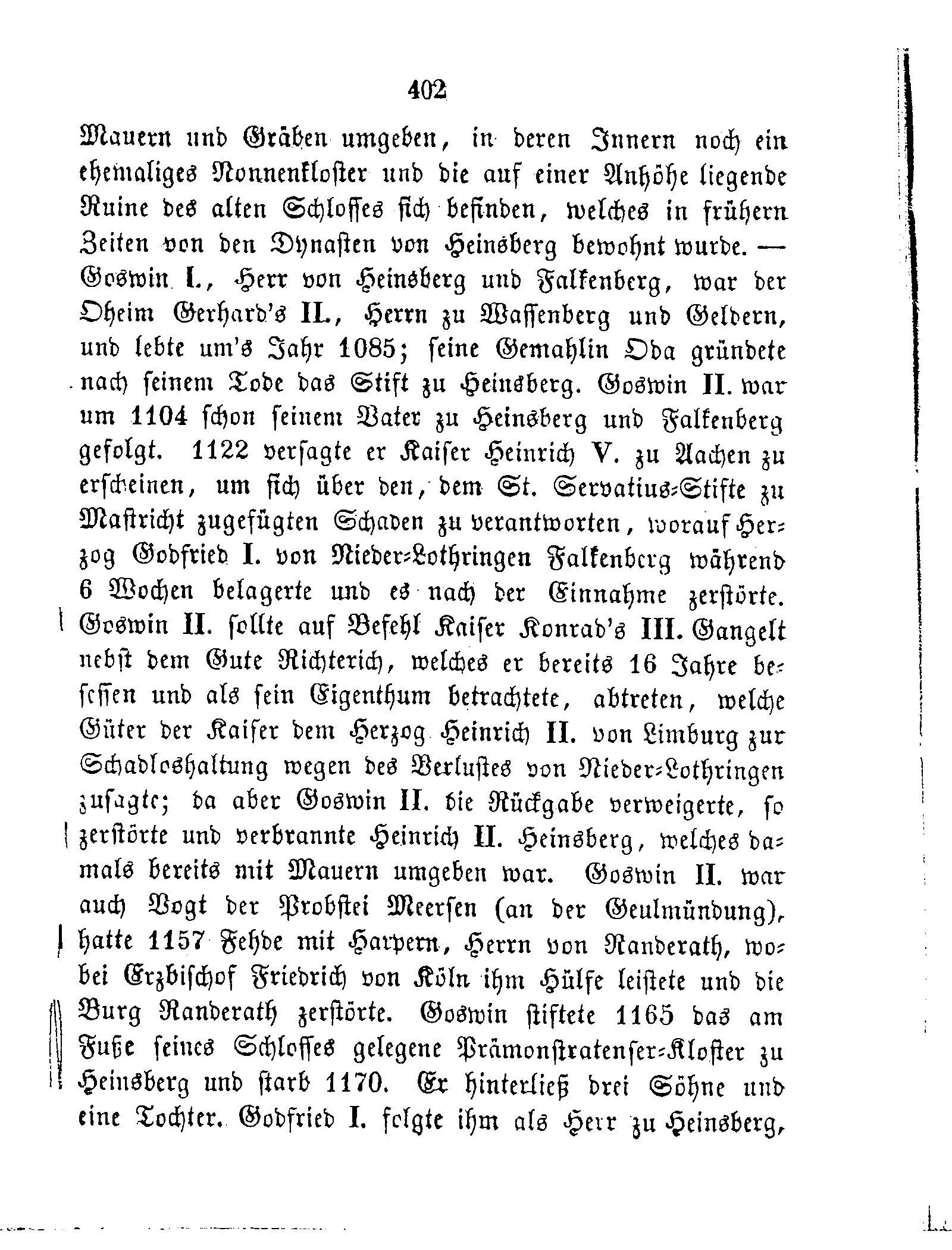 Mauern und Gräben umgeben, in deren Innern noch ein ehemaliges Nonnenkloster und die auf einer Anhöhe liegende Ruine des alten Schlosses sich befinden, welches in frühern Zeiten von den Dynasten von Heinsberg bewohnt wurde. — Goswin I., Herr von Heinsberg und Falkenberg, war der Oheim Gerhard's II., Herrn zu Wassenberg und Geldern, und lebte um's Jahr 1085; seine Gemahlin Oda gründete nach seinem Tode das Stift zu Heinsberg. Goswin II. war um 1104 schon seinem Vater zu Heinsberg und Falkenberg gefolgt. 1122 versagte er Kaiser Heinrich V. zu Aachen zu erscheinen, um sich über den, dem St. Servatius-Stifte zu Mastricht zugefügten Schaden zu verantworten, worauf Herzog Godfried I. von Nieder-Lothringen Falkenberg während 6 Wochen belagerte und es nach der Einnahme zerstörte. Goswin II. sollte auf Befehl Kaiser Konrad's III. Gangelt nebst dem Gute Richterich, welches er bereits 16 Jahre besessen und als sein Eigenthum betrachtete, abtreten, welche Güter der Kaiser dem Herzog Heinrich II. von Limburg zur Schadloshaltung wegen des Verlustes von Nieder-Lothringen zusagte; da aber Goswin II. die Rückgabe verweigerte, so zerstörte und verbrannte Heinrich II. Heinsberg, welches damals bereits mit Mauern umgeben war. Goswin II. war auch Vogt der Probstei Meersen (an der Geulmündung), hatte 1157 Fehde mit Harpern, Herrn von Randerath, wobei Erzbischof Friedrich von Köln ihm Hülfe leistete und die Burg Randerath zerstörte. Goswin stiftete 1165 das am Fuße seines Schlosses gelegene Prämonstratenser-Kloster zu Heinsberg und starb 1170. Er hinterließ drei Söhne und eine Tochter. Godfried I. folgte ihm als Herr zu Heinsberg,