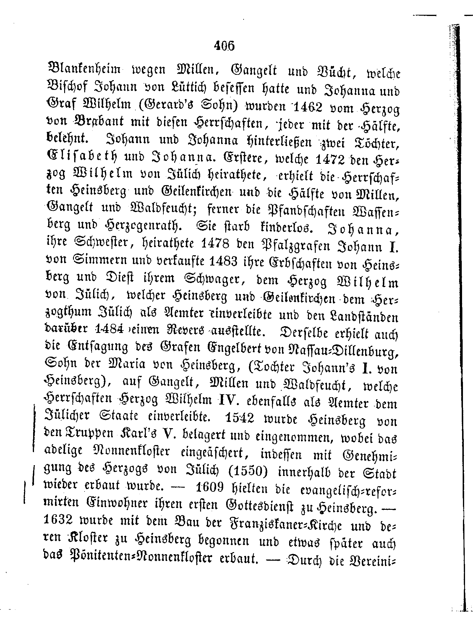 Blankenheim wegen Mitten, Gangelt und Vücht, welche Bischof Johann von Lüttich besessen hatte und Johanna und Graf Wilhelm (Gerard's Sohn) wurden 1462 vom Herzog von Brabant mit diesen Herrschaften, jeder mit der Hälfte, belehnt. Johann und Johanna hinterließen zwei Töchter, Elisabeth und Johanna. Erstere, welche 1472 den Herzog Wilhelm von Jülich heirathete, erhielt die Herrschaften Heinsberg und Geilenkirchen und die Hälfte von Millen, Gangelt und Waldfeucht; ferner die Pfandschaften Wassenberg und Herzogenrath. Sie starb kinderlos. Johanna, ihre Schwester, heirathete 1478 den Pfalzgrafen Johann I. von Simmern und verkaufte 1483 ihre Erbschaften von Heinsberg und Diest ihrem Schwager, dem Herzog Wilhelm von Jülich, welcher Heinsberg und Geilenkirchen dem Herzogthum Jülich als Aemter einverleibte und den Landständen darüber 1484 einen Revers ausstellte. Derselbe erhielt auch die Entsagung des Grafen Engelbert von Nassau-Dillenburg, Sohn der Maria von Heinsberg, (Tochter Johann's I. von Heinsberg), auf Gangelt, Millen und Waldfeucht, welche Herrschaften Herzog Wilhelm IV. ebenfalls als Aemter dem Jülicher Staate einverleibte. 1542 wurde Heinsberg von den Truppen Karl's V. belagert und eingenommen, wobei das adelige Nonnenkloster eingeäschert, indessen mit Genehmigung des Herzogs von Jülich (1550) innerhalb der Stadt wieber erbaut wurde. — 1609 hielten die evangelisch-reformirten Einwohner ihren ersten Gottesdienst zu Heinsberg. — 1632 wurde mit dem Bau der Franziskaner-Kirche und deren Kloster zu Heinsberg begonnen und etwas später auch das Pönitenten-Nonnenkloster erbaut. — Durch die Vereinigung