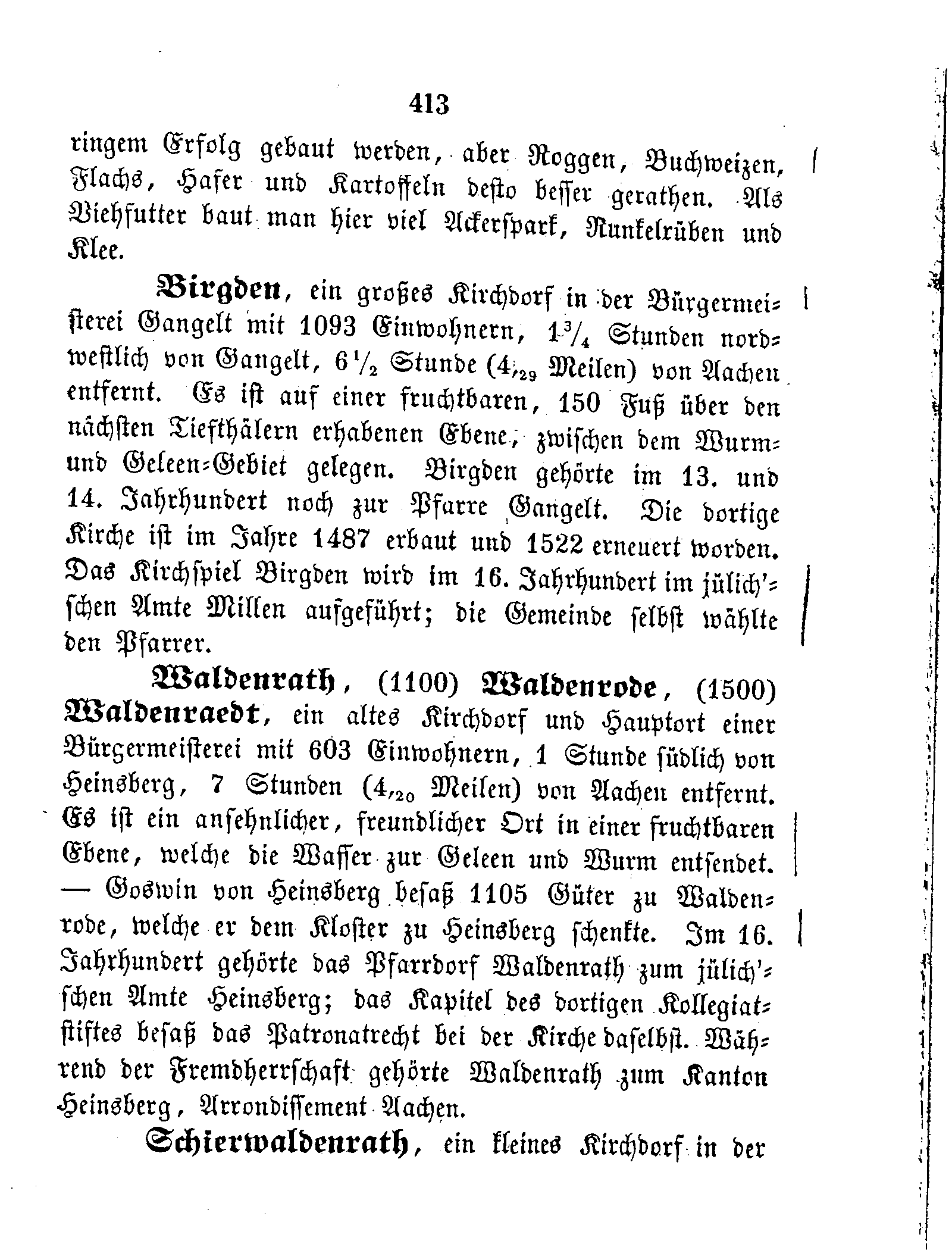 Waldenrath, (1100) Waldenrode, (1500) Waldenraedt, ein altes Kirchdorf und Hauptort einer Bürgermeisterei mit 603 Einwohnern, 1 Stunde südlich von Heinsberg, 7 Stunden (4,20 Meilen) von Aachen entfernt. Es ist ein ansehnlicher, freundlicher Ort in einer fruchtbaren Ebene, welche die Wasser zur Geleen und Wurm entsendet. — Goswin von Heinsberg besaß 1105 Güter zu Waldenrode, welche er dem Kloster zu Heinsberg schenkte. Im 16. Jahrhundert gehörte das Pfarrdorf Waldenrath zum jülich'schen Amte Heinsberg; das Kapitel des dortigen Kollegiatstiftes besaß das Patronatrecht bei der Kirche daselbst. Während der Fremdherrschaft gehörte Waldenrath zum Kanton Heinsberg, Arrondissement Aachen.