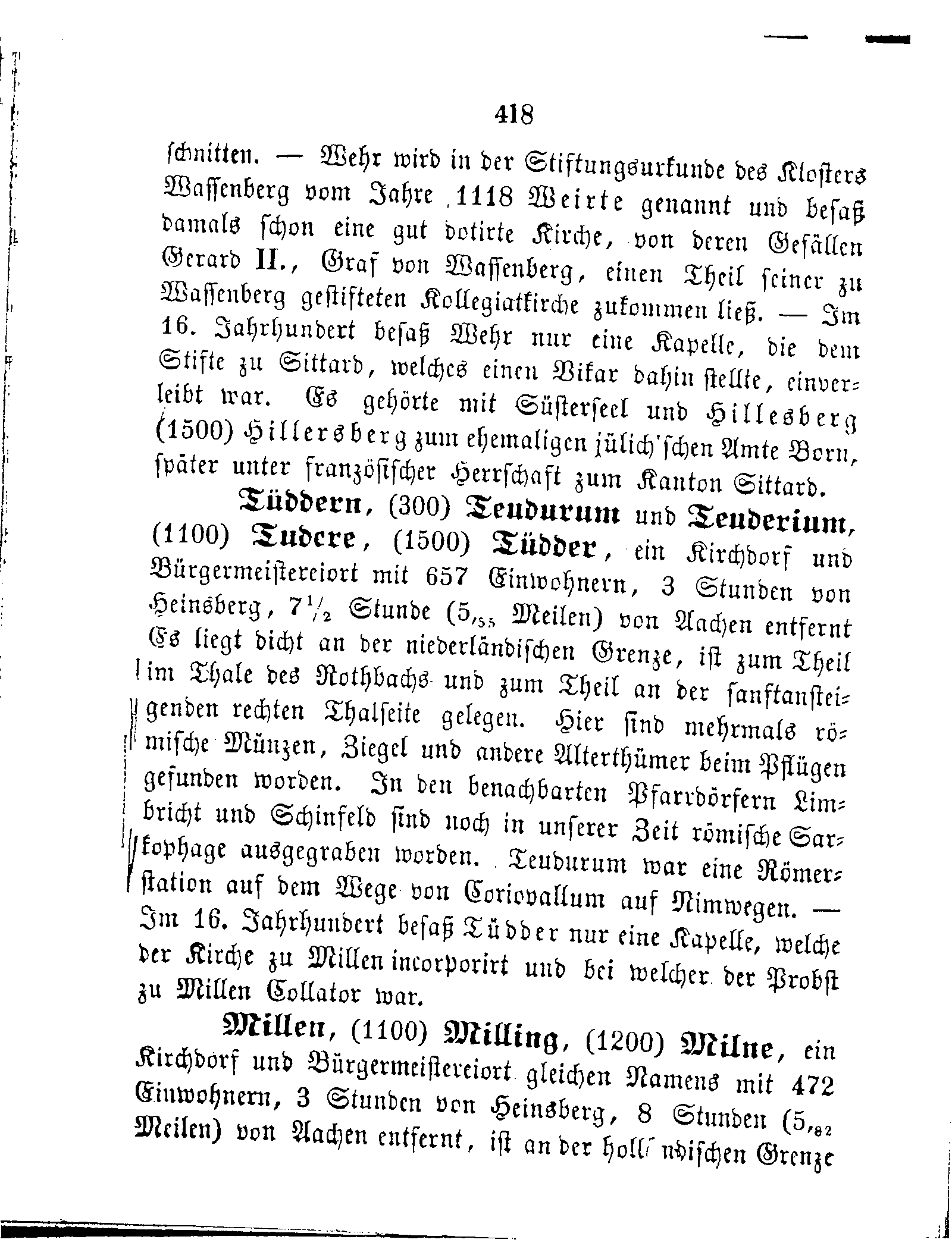 Tüddern, (300) Teudurum und Teuderium, (1100) Tudere, (1500) Tüdder, ein Kirchdorf und Bürgermeistereiort mit 657 Einwohnern, 3 Stunden von Heinsberg, 71/2 Stunde (555 Meilen) von Aachen entfernt. Es liegt dicht an der niederländischen Grenze, ist zum Theil im Thale des Rothbaches und zum Theil an der sanftansteigenden rechten Thalseite gelegen. Hier sind mehrmals römische Münzen, Ziegel und andere Alterthümer beim Pflügen gefunden worden. In den benachbarten Pfarrdörfern Limbricht und Schinfeld sind noch in unserer Zeit römische Sarkophage ausgegraben worden. Teudurum war eine Römerstation auf dem Wege von Coriovallum auf Nimwegen. - Im 16 Jahrhundert besaß Tüdder nur eine Kapelle, welche der Kirche zu Millen incorporirt und bei welcher der Probst zu Millen Collator war.