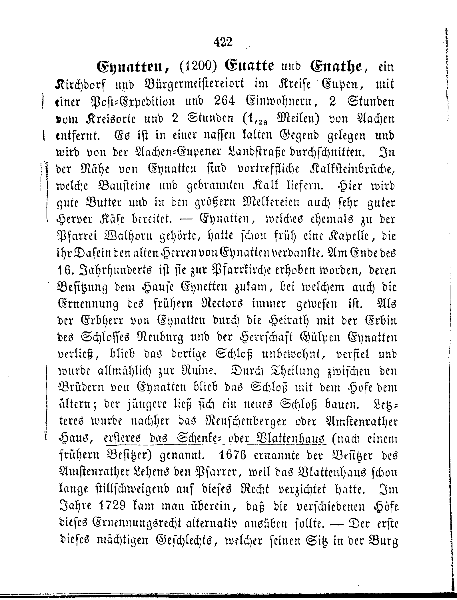 Eynatten, (1200) Enatte und Enathe, ein Kirchdorf und Bürgermeistereiort im Kreise Eupen, mit einer Post-Expedition und 264 Einwohnern, 2 Stunden vom Kreisorte und 2 Stunden (1,28 Meilen) von Aachen entfernt. Es ist in einer nassen kalten Gegend gelegen und wird von der Aachen-Eupener Landstraße durchschnitten. In der Nähe von Eynatten sind vortreffliche Kalksteinbrüche, welche Bausteine und gebrannten Kalk liefern. Hier wird gute Butter und in den größern Melkereien auch sehr guter Herver Käse bereitet. — Eynatten, welches ehemals zu der Pfarrei Walhorn gehörte, hatte schon früh eine Kapelle, die ihr Dasein den alten Herren von Eynatten verdankte. Am Ende des 16. Jahrhunderts ist sie zur Pfarrkirche erhoben worden, deren Besitzung dem Hause Eynetten zukam, bei welchem auch die Ernennung des frühern Rectors immer gewesen ist. Als der Erbherr von Eynatten durch die Heirath mit der Erbin des Schlosses Neuburg und der Herrschaft Gülpen Eynatten verließ, blieb das dortige Schloß unbewohnt, verfiel und wurde allmählich zur Ruine. Durch Theilung zwischen den Brüdern von Eynatten blieb das Schloß mit dem Hofe dem ältern; der jüngere ließ sich ein neues Schloß bauen. Letzteres wurde nachher das Reuschenberger oder Amstenrather Haus, ersteres das Schenke- oder Vlattenhaus (nach einem frühern Besitzer) genannt. 1676 ernannte der Besitzer des Amstenrather Lehens den Pfarrer, weil das Vlattenhaus schon lange stillschweigend auf dieses Recht verzichtet hatte. Im Jahre 1729 kam man überein, daß die verschiedenen Höfe dieses Ernennungsrecht alternativ ausüben sollte. — Der erste dieses mächtigen Geschlechts, welcher seinen Sitz in der Burg