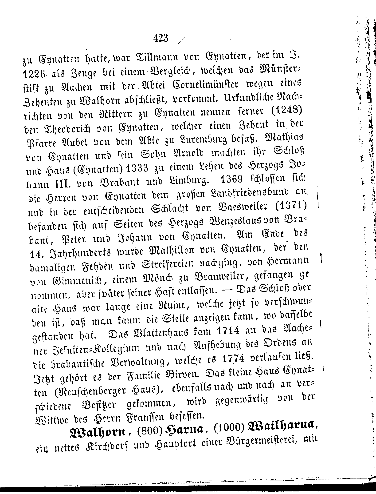 zu Eynatten hatte, war Tillmann von Eynatten, der im J. 1226 als Zeuge bei einem Vergleich, welchen das Münsterstift zu Aachen mit der Abtei Cornelimünster wegen eines Zehenten zu Walhorn abschließt, vorkommt. Urkundliche Nachrichten von den Rittern zu Eynatten nennen ferner (1248) den Theodorich von Eynatten, welcher einen Zehent in der Pfarre Aubel von dem Abte zu Luxemburg besaß. Mathias von Eynatten und sein Sohn Arnold machten ihr Schloß und Haus (Eynatten) 1333 zu einem Lehen des Herzogs Johann III. von Brabant und Limburg. 1369 schlossen sich die Herren von Eynatten dem großen Landfriedensbund an und in der entscheidenden Schlacht von Baesweiler (1371) befanden sich auf Seiten des Herzogs Wenzeslaus von Brabant, Peter und Johann von Eynatten. Am Ende des 14. Jahrhunderts wurde Mathillon von Eynatten, der den damaligen Fehden und Streifereien nachging, von Hermann von Gimmenich, einem Mönch zu Brauweiler, gefangen genommen, aber später seiner Haft entlassen. — Das Schloß oder alte Haus war lange eine Ruine, welche jetzt so verschwunden ist, daß man kaum die Stelle anzeigen kann, wo dasselbe gestanden hat. Das Vlattenhaus kam 1714 an das Aachener Jesuiten-Kollegium und nach Aufhebung des Ordens an die brabantische Verwaltung, welche es 1774 verkaufen ließ. Jetzt gehört es der Familie Birven. Das kleine Haus Eynatten (Reuschenberger Haus), ebenfalls nach und nach an verschiedene Besitzer gekommen, wird gegenwärtig von der Wittwe des Herrn Franssen besessen.