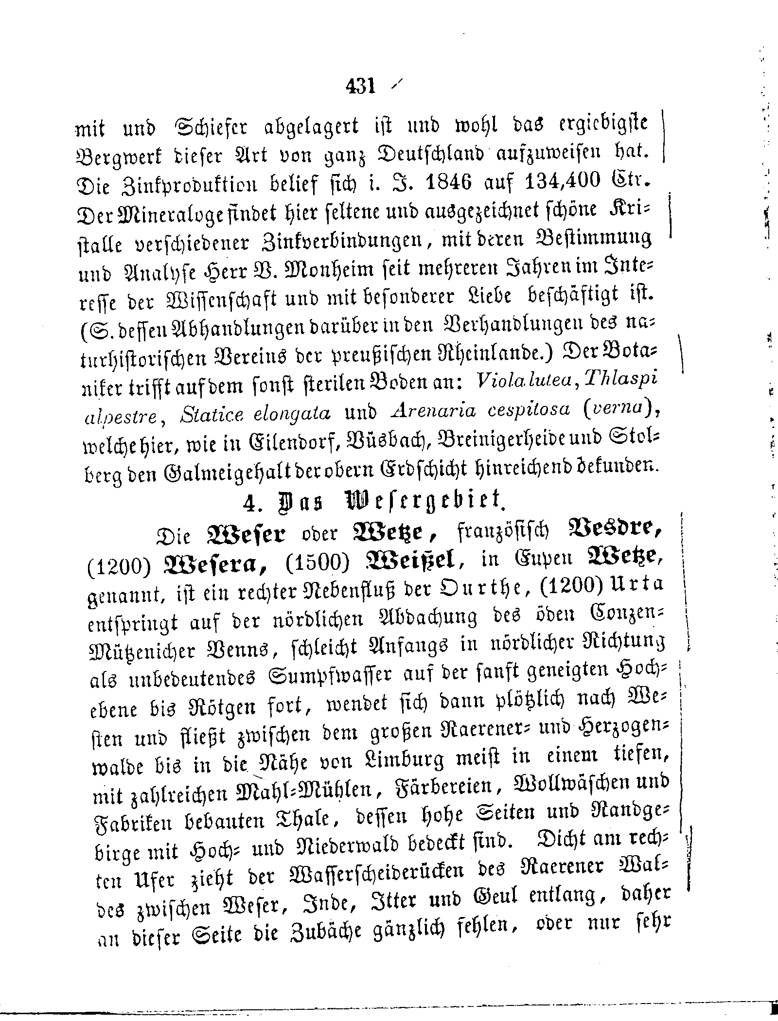 und Schiefer abgelagert ist und wohl das ergiebigste Bergwerk dieser Art von ganz Deutschland aufzuweisen hat. Die Zinkproduktion belief sich i. J. 1846 auf 134,400 Ctr. Der Mineraloge findet hier seltene und ausgezeichnet schöne Kristalle verschiedener Zinkverbindnngen, mit deren Bestimmung und Analyse Herr V. Monheim seit mehreren Jahren im Interesse der Wissenschaft und mit besonderer Liebe beschäftigt ist. (S. dessen Abhandlungen darüber in den Verhandlungen des naturhistorischen Vereins der preußischen Rheinlande.) Der Botaniker trifft auf dem sonst sterilen Boden an: Viola lutea, Thlaspi alpestre, Statice elongata und Arenaria cespitosa (verna) welche hier, wie in Eilendorf, Büsbach, Breinigerheide und Stolberg den Galmeigehalt der obern Erdschicht hinreichend bekunden.