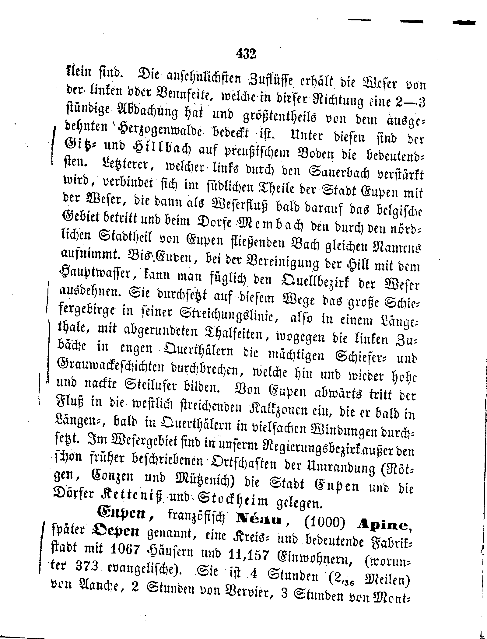 Eupen, französisch Néau, (1000) Apine, später Oepen genannt, eine Kreis- und bedeutende Fabrikstadt mit 1067 Häusern und 11,157 Einwohnern, (worunter 373 evangelische). Sie ist 4 Stunden (2,36 Meilen) von Aachen, 2 Stunden von Vervier, 3 Stunden von Montjoie
