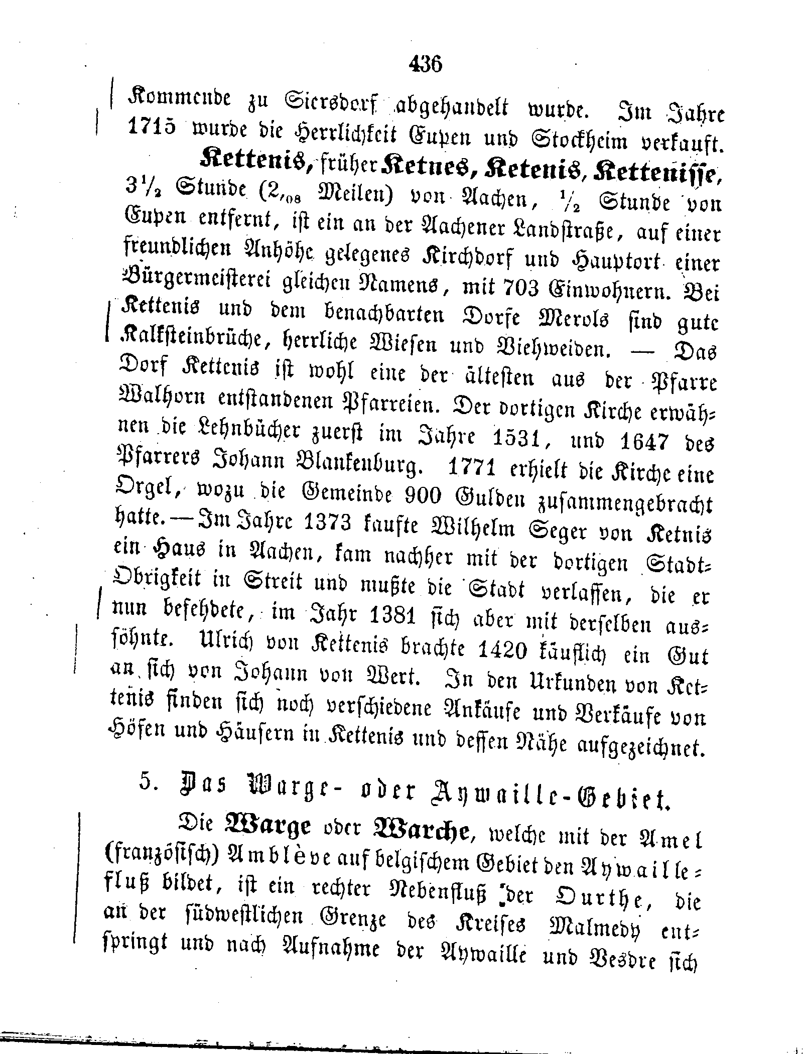 Kettenis, früher Ketnes, Ketenis, Kettenisse, 31/2 Stunde (2,08 Meilen) von Aachen, 1/2 Stunde von Eupen entfernt, ist ein an der Aachener Landstraße, auf einer freundlichen Anhöhe gelegenes Kirchdorf und Hauptort einer Bürgermeisterei gleichen Namens, mit 703 Einwohnern. Bei Kettenis und dem benachbarten Dorfe Merols sind gute Kalksteinbrüche, herrliche Wiesen und Viehweiden. — Das Dorf Kettenis ist wohl eine der ältesten aus der Pfarre Walhorn entstandenen Pfarreien. Der dortigen Kirche erwähnen die Lehnbücher zuerst im Jahre 1531, und 1647 des Pfarrers Johann Blankenburg. 1771 erhielt die Kirche eine Orgel, wozu die Gemeinde 900 Gulden zusammengebracht hatte. — Im Jahre 1373 kaufte Wilhelm Seger von Ketnis ein Haus in Aachen, kam nachher mit der dortigen Stadt-Obrigkeit in Streit und mußte die Stadt verlassen, die er nun befehdete, im Jahr 1381 sich aber mit derselben aussöhnte. Ulrich von Kettenis brachte 1420 käuflich ein Gut an sich von Johann von Wert. In den Urkunden von Kettenis finden sich noch verschiedene Ankäufe und Verkäufe von Höfen und Häusern in Kettenis und dessen Nähe aufgezeichnet.