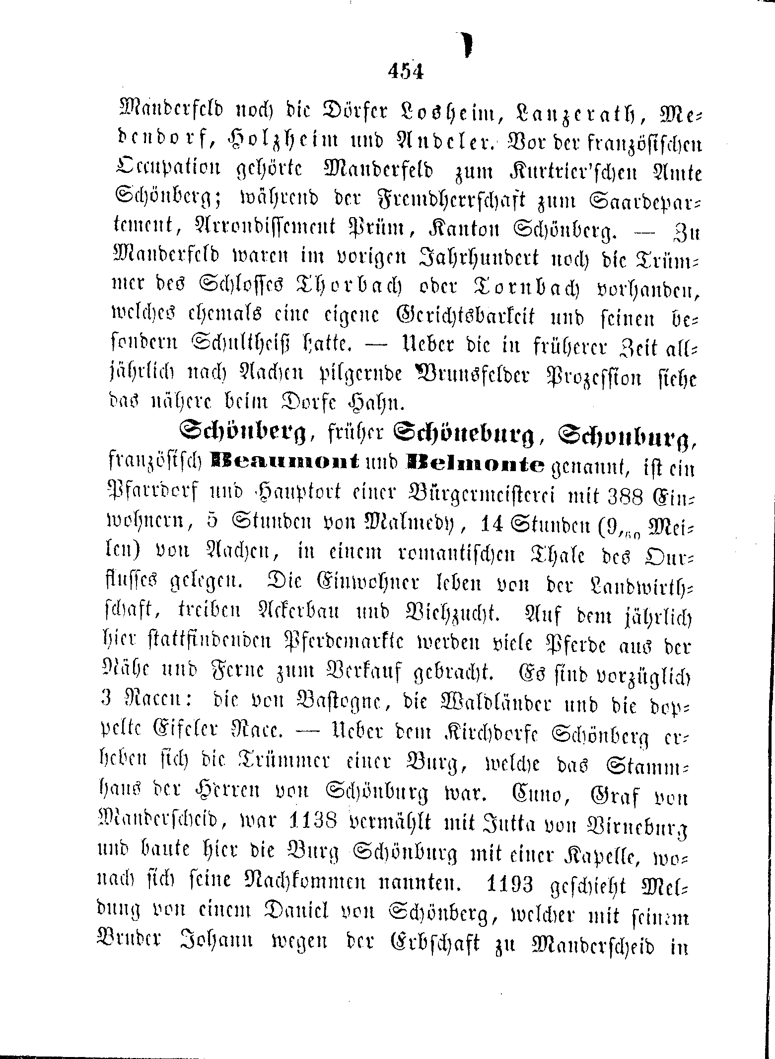 Manderfeld noch die Dörfer Losheim, Lanzerath, Medendorf, Holzheim und Andeler. Vor der französischen Occupation gehörte Manderfeld zum Kurtrier'schen Amte Schönberg; während der Fremdherrschaft zum Saardepartement, Arrondissement Prüm, Kanton Schönberg. — Zu Manderfeld waren im vorigen Jahrhundert noch die Trümmer des Schlosses Thorbach oder Tornbach vorhanden, welches ehemals eine eigene Gerichtsbarkeit und seinen besondern Schultheiß hatte. — Ueber die in früherer Zeit alljährlich nach Aachen pilgernde Brunsfelder Prozession siehe das nähere beim Dorfe Hahn.