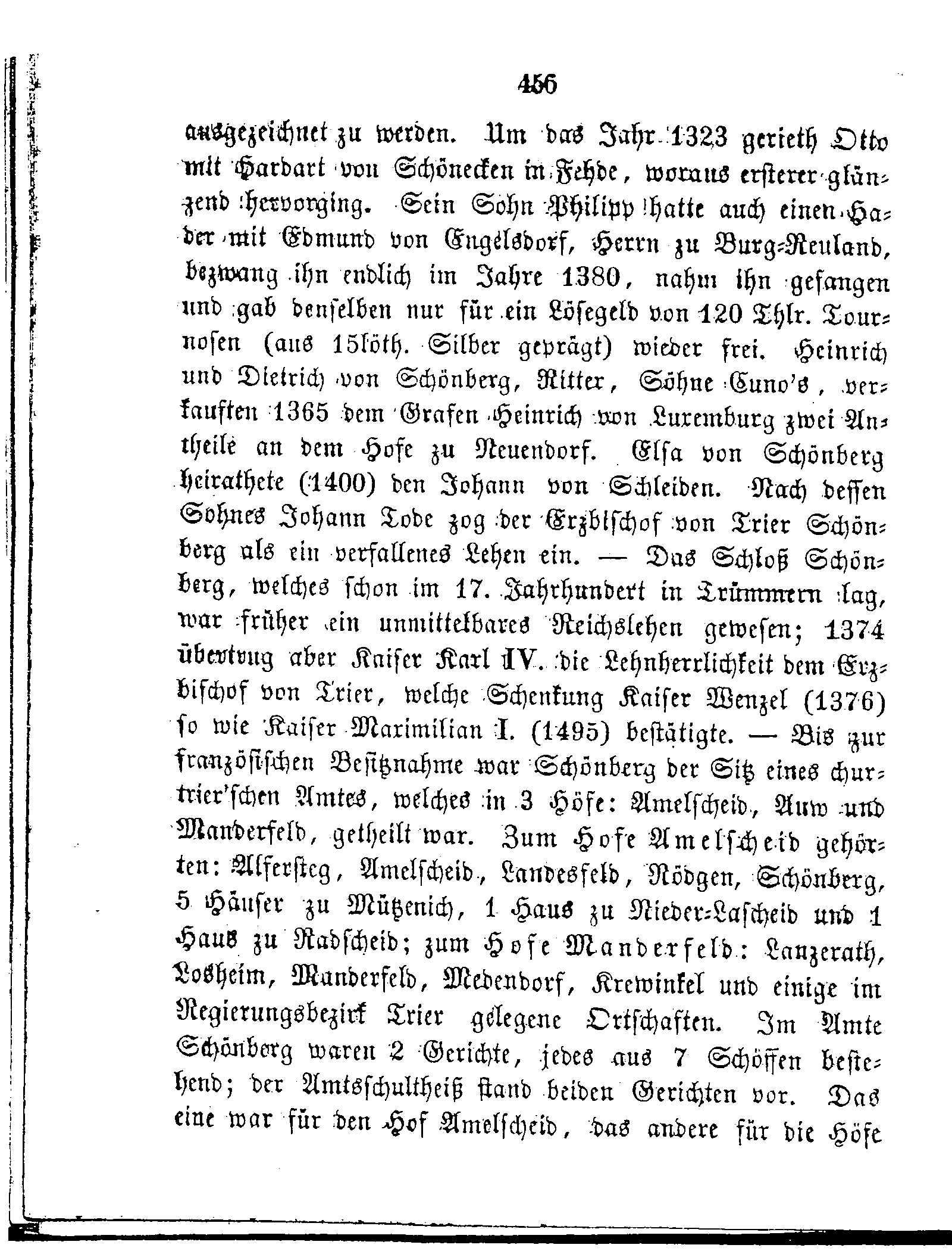ausgezeichnet zu werden. Um das Jahr 1323 gerieth Otto mit Hardart von Schönecken in Fehde, woraus ersterer glänzend hervorging. Sein Sohn Philipp hatte auch einen Hader mit Edmund von Engelsdorf, Herrn zu Burg-Reuland, bezwang ihn endlich im Jahre 1380, nahm ihn gefangen und gab denselben nur für ein Lösegeld von 120 Thlr. Tournosen (aus 15löth. Silber geprägt) wieder frei. Heinrich und Dietrich von Schönberg, Ritter, Söhne Cuno's, verkauften 1365 dem Grafen Heinrich von Luxemburg zwei Antheile an dem Hofe zu Neuendorf. Elsa von Schönberg heirathete (1400) den Johann von Schleiden. Nach dessen Sohnes Johann Tode zog der Erzbischof von Trier Schönberg als ein verfallenes Lehen ein. — Das Schloß Schönberg, welches schon im 17. Jahrhundert in Trümmern lag, war früher ein unmittelbares Reichslehen gewesen; 1374 übertrug aber Kaiser Karl IV. die Lehnherrlichkeit dem Erzbischof von Trier, welche Schenkung Kaiser Wenzel (1376) so wie Kaiser Maximilian I. (1495) bestätigte. — Bis zur französischen Besitznahme war Schönberg der Sitz eines churtrier'schen Amtes, welches in 3 Höfe: Amelscheid, Auw und Manderfeld, getheilt war. Zum Hofe Amelscheid gehörten: Alfersteg, Amelscheid, Landesfeld, Rödgen, Schönberg, 5 Häuser zu Mützenich, 1 Haus zu Nieder-Lascheid und 1 Haus zu Radscheid; zum Hofe Manderfeld: Lanzerath, Losheim, Manderfeld, Medendorf, Krewinkel und einige im Regierungsbezirk Trier gelegene Ortschaften. Im Amte Schönberg waren 2 Gerichte, jedes aus 7 Schöffen bestehend; der Amtsschultheiß stand beiden Gerichten vor. Das eine war für ben Hof Amelscheid, das andere für die Höfe