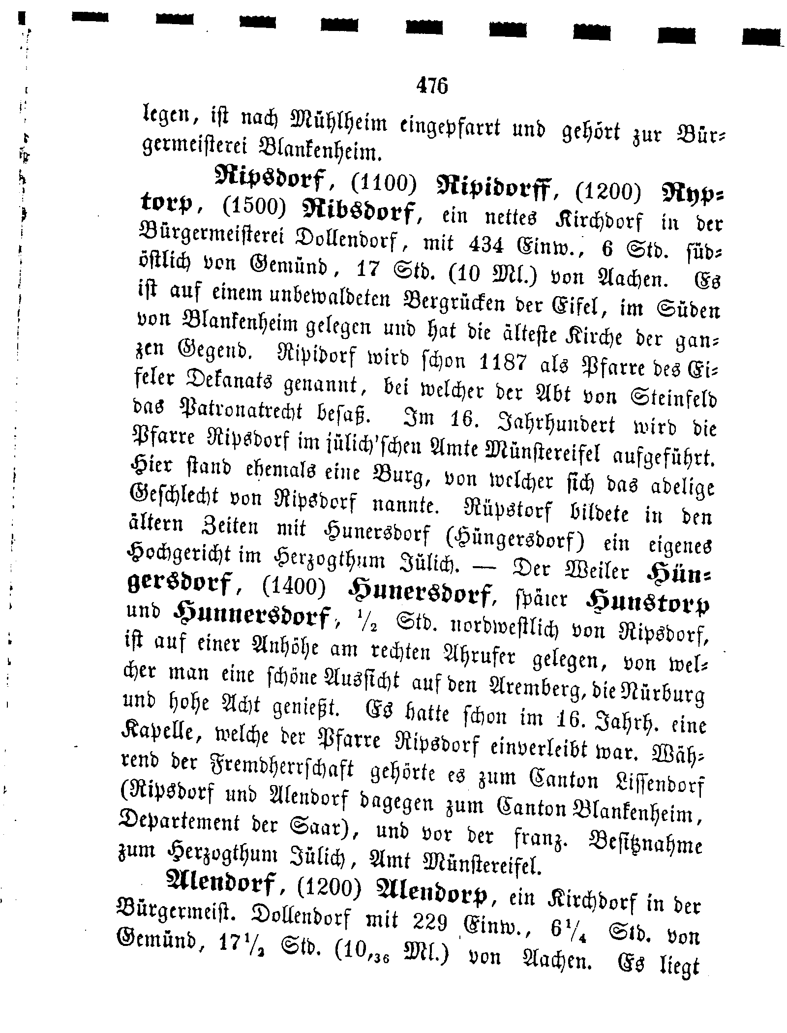 Ripsdorf, (1100) Ripidorff, (1200) Ryptorp, (1500) Ribsdorf, ein nettes Kirchdorf in der Bürgermeisterei Dollendorf, mit 434 Einw., 6 Std. südöstlich von Gemünd, 17 Std. (10 Ml.) von Aachen. Es ist auf einem unbewaldeten Bergrücken der Eifel, im Süden von Blankenheim gelegen und hat die älteste Kirche der ganzen Gegend. Ripidorf wird schon 1187 als Pfarre des Eifeler Dekanats genannt, bei welcher der Abt von Steinfeld das Patronatrecht besaß. Im 16. Jahrhundert wird die Pfarre Ripsdorf im jülich'schen Amte Münstereifel aufgeführt. Hier stand ehemals eine Burg, von welcher sich das adelige Geschlecht von Ripsdorf nannte. Rüpstorf bildete in den ältern Zeiten mit Hunersdorf (Hüngersdorf) ein eigenes Hochgericht im Herzogtum Jülich. — Der Weiler Hüngersdorf, (1400) Hunersdorf, später Hunstorp und Hunnersdorf, 1/2 Std. nordwestlich von Ripsdorf, ist auf einer Anhöhe am rechten Ahrufer gelegen, von welcher man eine schöne Aussicht auf den Aremberg, die Nürburg und hohe Acht genießt. Es hatte schon im 16. Jahrh. eine Kapelle, welche der Pfarre Ripsdorf einverleibt war. Während der Fremdherrschaft gehörte es zum Canton Lissendorf (Ripsdorf und Alendorf dagegen zum Canton Blankenheim, Departement der Saar), und vor der franz. Besitznahme zum Herzogthum Jülich, Amt Münstereifel.