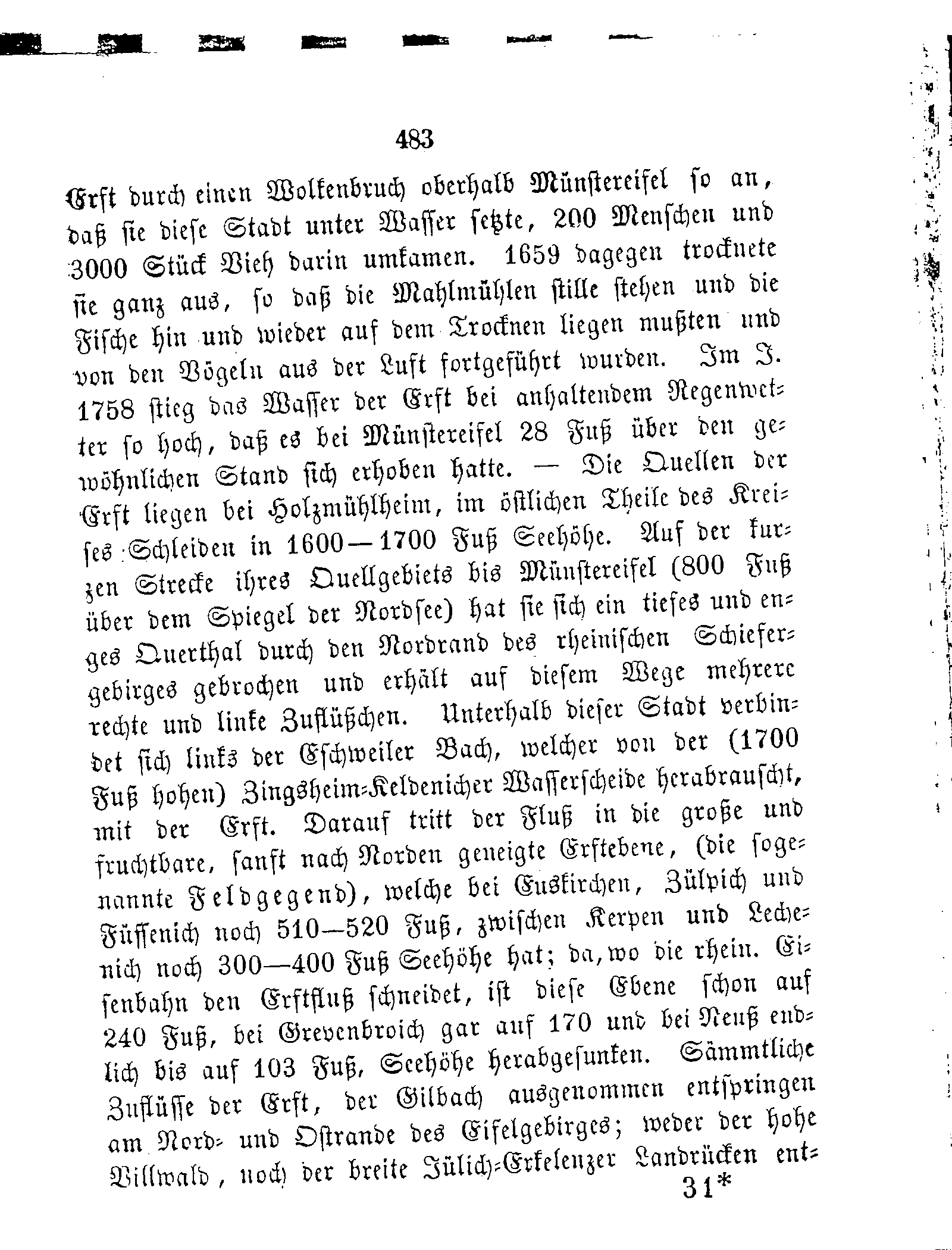 Erft durch einen Wolkenbruch oberhalb Münstereifel so an, daß sie diese Stadt unter Wasser setzte, 200 Menschen und 3000 Stück Vieh darin umkamen. 1659 dagegen trocknete sie ganz aus, so daß die Mahlmühlen stille stehen und die Fische hin und wieder auf dem Trocknen liegen mußten und von den Vögeln aus der Luft fortgeführt wurden. Im J. 1758 stieg das Wasser der Erft bei anhaltendem Regenwetter so hoch, daß es bei Münstereifel 28 Fuß über den gewöhnlichen Stand sich erhoben hatte. – Die Quellen der Erft liegen bei Holzmühlheim, im östlichen Theile des Kreises Schleiden in 1600-1700 Fuß Seehöhe. Auf der kurzen Strecke ihres Quellgebiets bis Münstereifel (800 Fuß über dem Spiegel der Nordsee) hat sie sich ein tiefes und enges Querthal durch den Nordrand des rheinischen Schiefergebirges gebrochen und erhält auf diesem Wege mehrere rechte und linke Zuflüßchen. Unterhalb dieser Stadt verbindet sich links der Eschweiler Bach, welcher von der (1700 Fuß hohen) Zingsheim-Keldenicher Wasserscheide herabrauscht, mit der Erft. Darauf tritt der Fluß in die große und fruchtbare, sanft nach Norden geneigte Erftebene, (die sogenannte Feldgegend), welche bei Euskirchen, Zülpich und Füssenich noch 510-520 Fuß, zwischen Kerpen und Lechenich noch 300-400 Fuß Seehöhe hat; da, wo die rhein. Eisenbahn den Erftfluß schneidet, ist diese Ebene schon auf 240 Fuß, bei Grevenbroich gar auf 170 und bei Neuß endlich bis auf 103 Fuß, Seehöhe herabgesunken. Sämmtliche Zuflüsse der Erft, der Gilbach ausgenommen entspringen am Nord- und Ostrande des Eifelgebirges; weder der hohe Villwald, noch der breite Jülich-Erkelenzer Landrücken entsenden