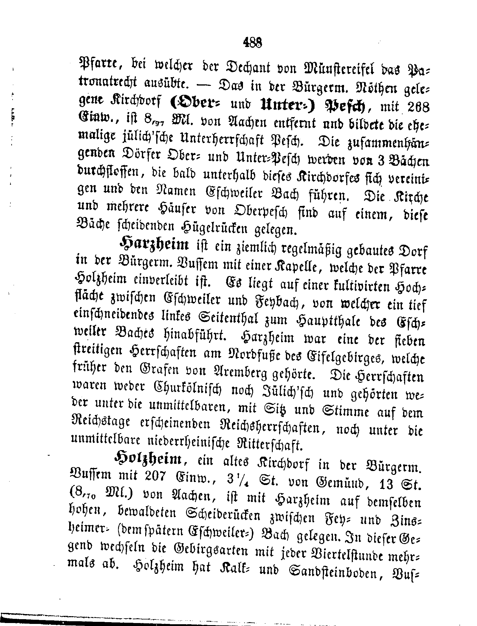 Harzheim ist ein ziemlich regelmäßig gebautes Dorf in der Bürgerm. Vussem mit einer Kapelle, welche der Pfarre Holzheim einverleibt ist. Es liegt auf einer kultivirten Hochfläche zwischen Eschweiler und Feybach, von welcher ein tief einschneidendes linkes Seitenthal zum Hauptthale des Eschweiler Baches hinabführt. Harzheim war eine der sieben streitigen Herrschaften am Nordfuße des Eifelgebirges, welche früher den Grafen von Aremberg gehörte. Die Herrschaften waren weder Churkölnisch noch Jülich'sch und gehörten weder unter die unmittelbaren, mit Sitz und Stimme auf dem Reichstage erscheinenden Reichsherrschaften, noch unter die unmittelbare niederrheinische Ritterschaft.