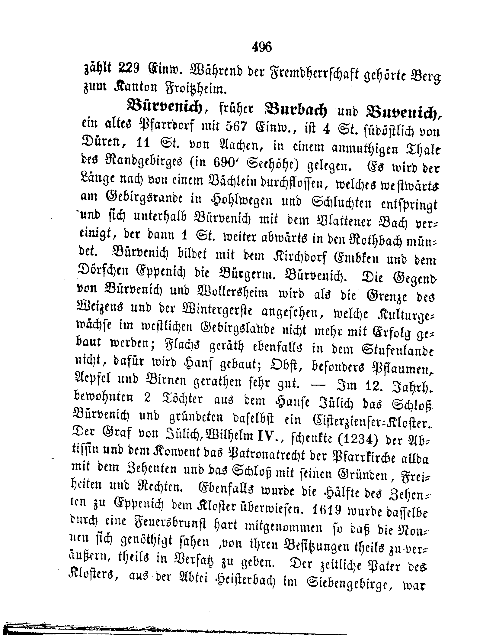 Bürvenich, früher Burbach und Buvenich, ein altes Pfarrdorf mit 567 Einw., ist 4 St. südöstlich von Düren, 11 St. von Aachen, in einem anmuthigen Thale des Randgebirges (in 690' Seehöhe) gelegen. Es wird der Länge nach von einem Büchlein durchflossen, welches westwärts am Gebirgsrande in Hohlwegen und Schluchten entspringt und sich unterhalb Bürvenich mit dem Vlattener Bach vereinigt, der dann 1 St. weiter abwärts in den Rothbach mündet. Bürvenich bildet mit dem Kirchdorf Embken und dem Dörfchen Eppenich die Bürgerm. Bürvenich. Die Gegend von Bürvenich und Wollersheim wird als die Grenze des Weizens und der Wintergerste angesehen, welche Kulturgewächse im westlichen Gebirgslande nicht mehr mit Erfolg gebaut werden; Flachs geräth ebenfalls in dem Stufenlande nicht, dafür wird Hanf gebaut; Obst, besonders Pflaumen, Aepfel und Birnen gerathen sehr gut. — Im 12. Jahrh. bewohnten 2 Töchter aus dem Hause Jülich das Schloß Bürvenich und gründeten daselbst ein Cisterzienser-Kloster. Der Graf von Jülich, Wilhelm IV., schenkte (1234) der Abtissin und dem Konvent das Patronatrecht der Pfarrkirche allda mit dem Zehenten und das Schloß mit seinen Gründen, Freiheiten und Rechten. Ebenfalls wurde die Hälfte des Zehenten zu Eppenich dem Kloster überwiesen. 1619 wurde dasselbe durch eine Feuersbrunst hart mitgenommen so daß die Nonnen sich genöthigt sahen, von ihren Besitzungen theils zu veräußern, theils in Versatz zu geben. Der zeitliche Pater des Klosters, aus der Abtei Heisterbach im Siebengebirge, war