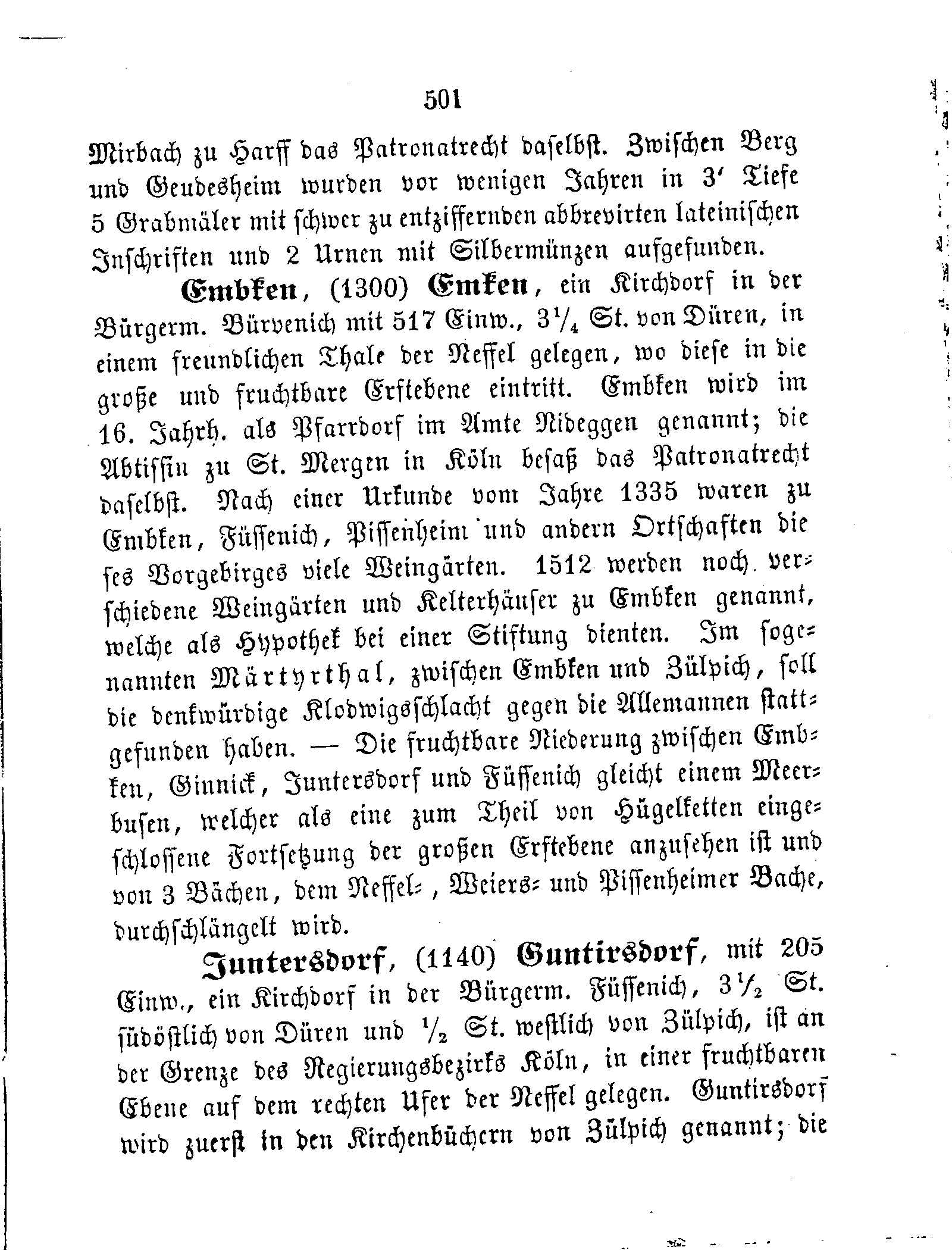 Embken, (1300) Emken, ein Kirchdorf in der Bürgerm. Bürvenich mit 517 Einw., 31/4 St. von Düren, in einem freundlichen Thale der Neffel gelegen, wo diese in die große und fruchtbare Erftebene eintritt. Embken wird im 16. Jahrh. als Pfarrdorf im Amte Nideggen genannt; die Abtissin zu St. Mergen in Köln besaß das Patronatrecht daselbst. Nach einer Urkunde vom Jahre 1335 waren zu Embken, Füssenich, Pissenheim und andern Ortschaften dieses Vorgebirges viele Weingärten. 1512 werden noch verschiedene Weingärten und Kelterhäuser zu Embken genannt, welche als Hypothek bei einer Stiftung dienten. Im sogenannten Märtyrthal, zwischen Embken und Zülpich, soll die denkwürdige Klodwigsschlacht gegen die Allemannen stattgefunden haben. — Die fruchtbare Niederung zwischen Embken, Ginnick, Juntersdorf und Füssenich gleicht einem Meerbusen, welcher als eine zum Theil von Hügelketten eingeschlossene Fortsetzung der großen Erftebene anzusehen ist und von 3 Bächen, dem Neffel-, Weiers- und Pissenheimer Bache, durchschlängelt wird.
