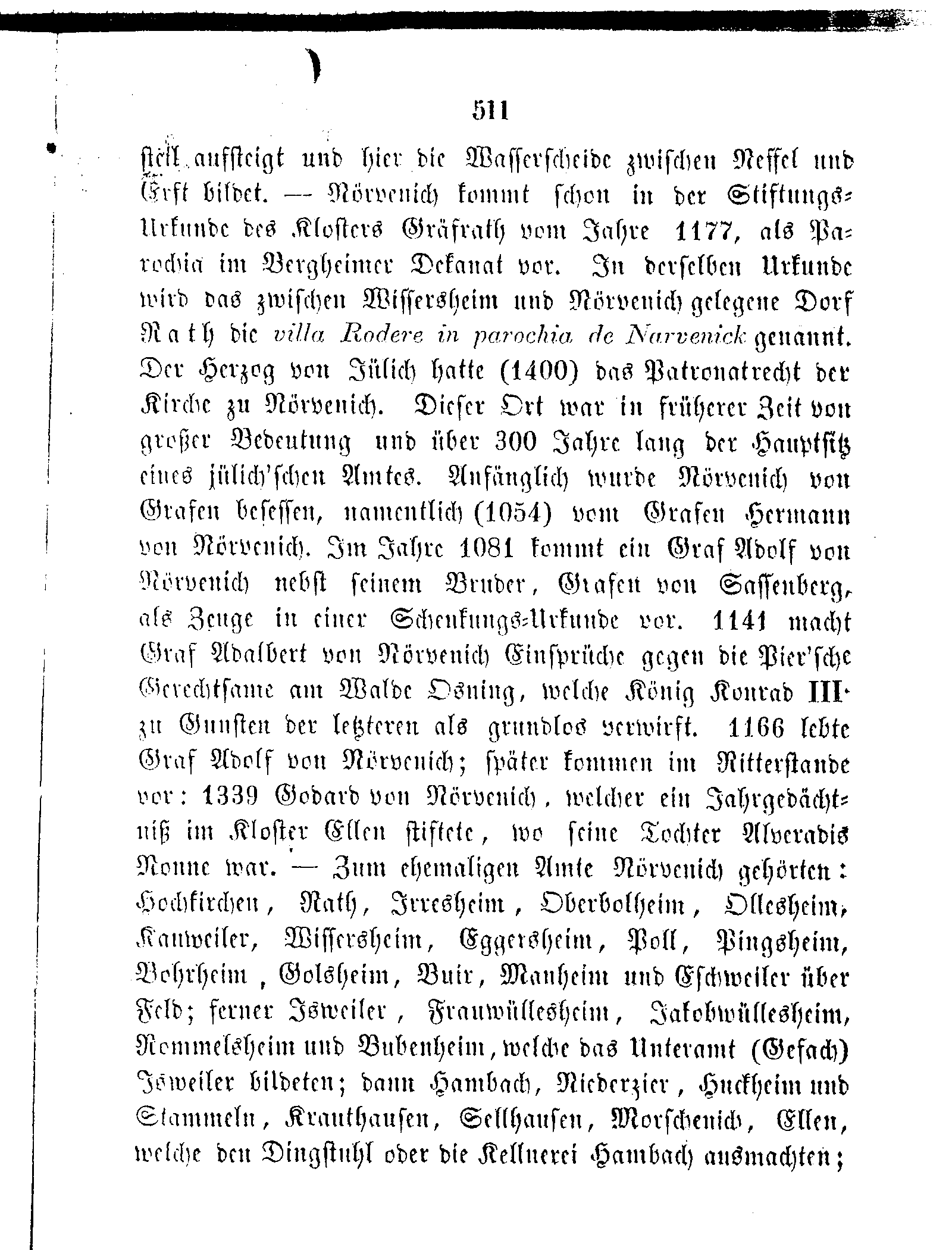 steil, aufsteigt und hier die Wasserscheide zwischen Neffel und Erft bildet. — Nörvenich kommt schon in der Stiftuugs-Urkunde des Klosters Gräfrath vom Jahre 1177, als Parochia im Bergheimer Dekanat vor. In derselben Urkunde wird das zwischen Wissersheim und Nörvenich gelegene Dorf Rath die villa Rodere in parochia de Narvenick genannt. Der Herzog von Jülich hatte (1400) das Patronatrecht der Kirche zu Nörvenich. Dieser Ort war in früherer Zeit von großer Bedeutung und über 300 Jahre lang der Hauptsitz eines jülich'schen Amtes. Anfänglich wurde Nörvenich von Grafen besessen, namentlich (1054) vom Grafen Hermann von Nörvenich. Im Jahre 1081 kommt ein Graf Adolf von Nörvenich nebst seinem Bruder, Grafen von Sassenberg, als Zeuge in einer Schenkungs-Urkunde vor. 1141 macht Graf Adalbert von Nörvenich Einsprüche gegen die Pier'sche Gerechtsame am Walde Osning, welche König Konrad III. zu Gunsten der letzteren als grundlos verwirft. 1166 lebte Graf Adolf von Nörvenich; später kommen im Ritterstande vor: 1339 Godard von Nörvenich, welcher ein Jahrgedächtniß im Kloster Ellen stiftete, wo seine Tochter Alveradis Nonne war. — Zum ehemaligen Amte Nörvenich gehörten: Hochkirchen, Rath, Irresheim, Oberbolheim, Ollesheim, Kanweiler, Wissersheim, Eggersheim, Poll, Pingsheim, Bohrheim , Golsheim, Buir, Manheim und Eschweiler über Feld; ferner Isweiler, Frauwüllesheim, Jakobwüllesheim, Rommelsheim und Bubenheim, welche das Unteramt (Gefach) Isweiler bildeten; dann Hambach, Niederzier, Huckheim und Stammeln, Krauthausen, Sellhausen, Morschenich, Ellen, welche den Dingstuhl oder die Kellnerei Hambach ausmachten;