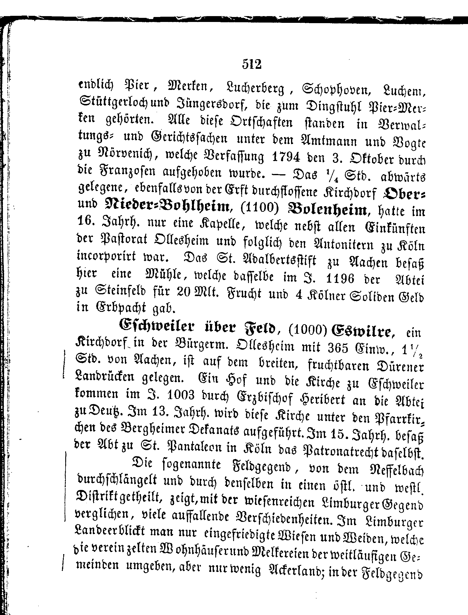endlich Pier, Merken, Lucherberg, Schophoven, Luchem, Stüttgerloch und Jüngersdorf, die zum Dingstuhl Pier-Merken gehörten. Alle diese Ortschaften standen in Verwaltungs- und Gerichtssachen unter dem Amtmann und Vogte zu Nörvenich, welche Verfassung 1794 den 3. Oktober durch die Franzosen aufgehoben wurde. — Das 1/4 Std. abwärts gelegene, ebenfalls von der Erft durchflosse Kirchdorf Ober- und Nieder-Bohlheim, (1100) Bolenheim, hatte im 16. Jahrh. nur eine Kapelle, welche nebst allen Einkünften der Pastorat Ollesheim und folglich den Antonitern zu Köln incorporirt war. Das St. Adalbertsftift zu Aachen besaß hier eine Mühle, welche dasselbe im J. 1196 der Abtei zu Steinfeld für 20 Mlt. Frucht und 4 Kölner Soliden Geld in Erbpacht gab.