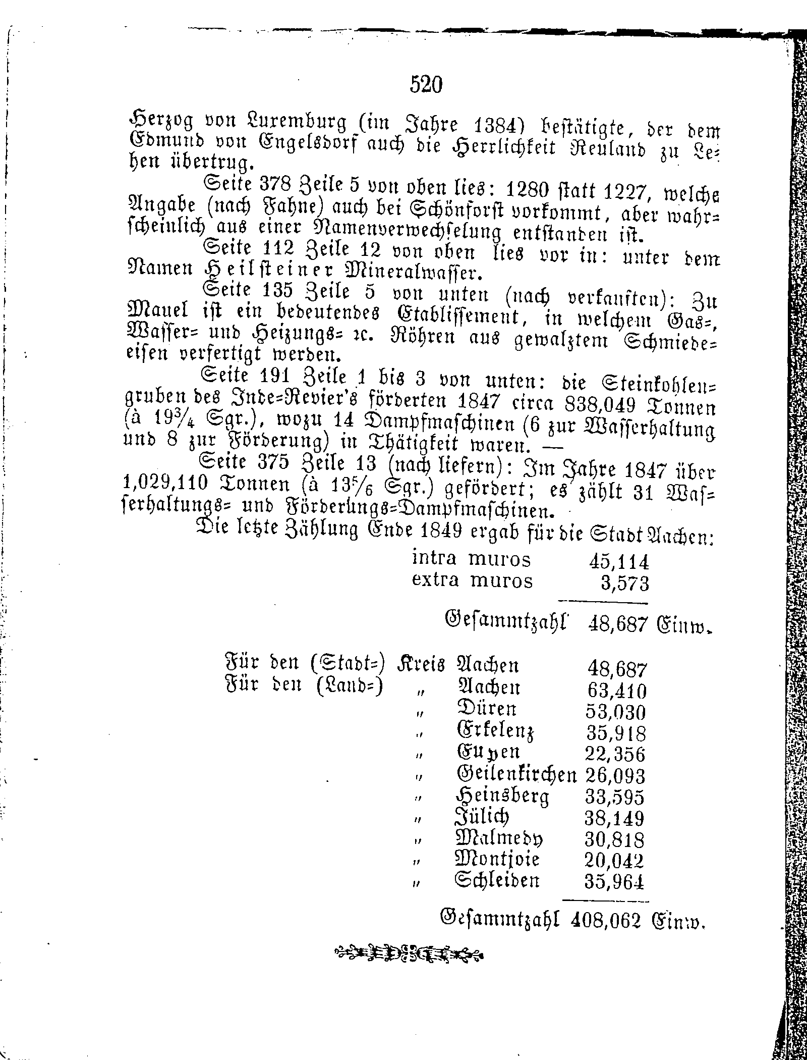 Seite 191 Zeile 1 bis 3 von unten: die Steinkohlengruben des Inde-Revier's förderten 1847 circa 838,049 Tonnen (à 193/4 Sgr.), wozu 14 Dampfmaschinen (6 zur Wasserhaltung und 8 zur Förderung) in Thätigkeit waren. —