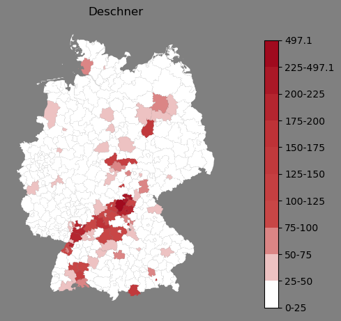 Absolute Verteilung des Namens Deschner (1890)Direkt zur Karte Absolute Verteilung des Namens "Deschner" um 1890 im damaligen Deutschen Reich Sie können die Karte innerhalb des Fensters zoomen und verschieben. |