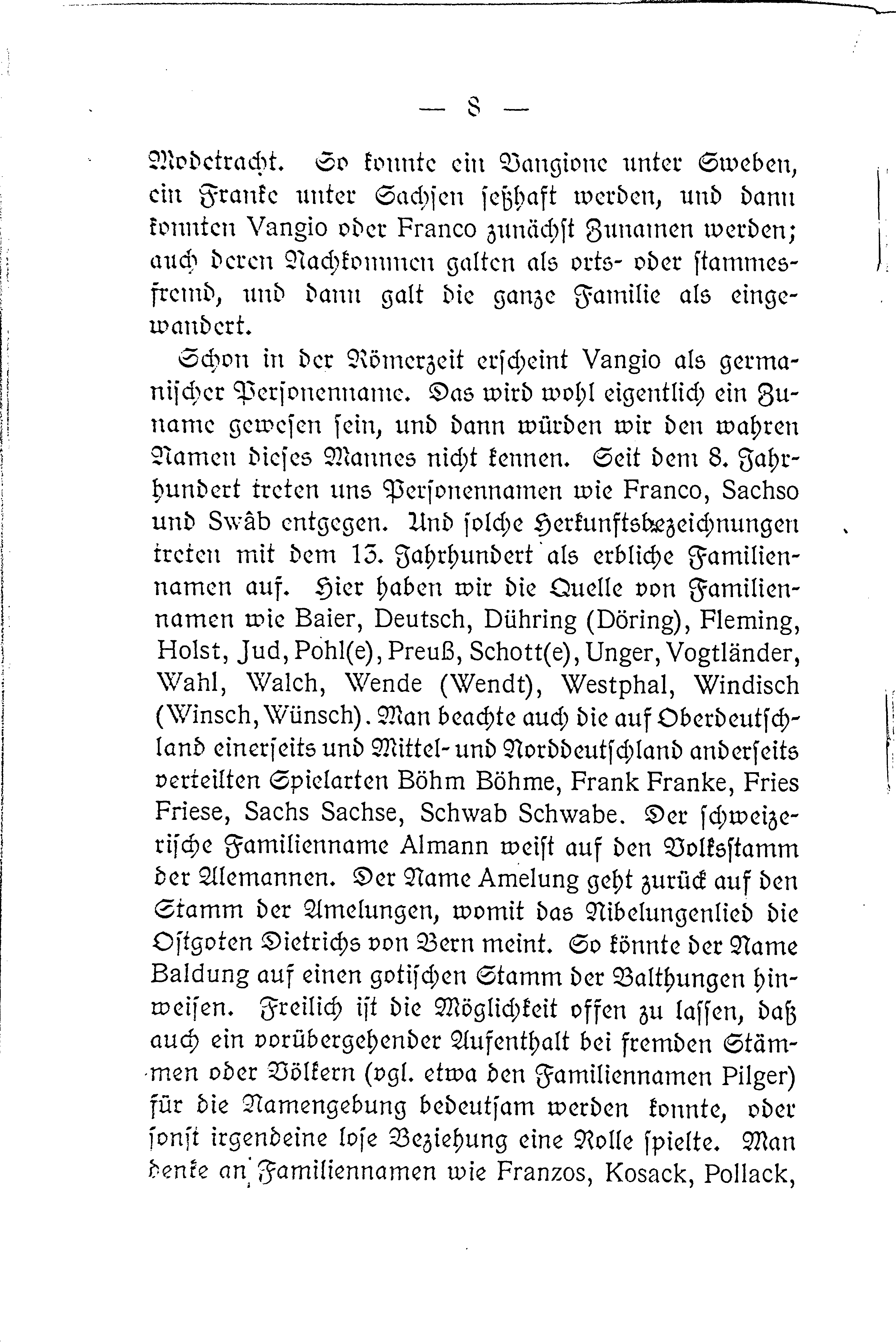 Modetracht. So konnte ein Vangione unter Sweben, ein Franke unter Sachsen seßhaft werden, und dann konnten Vangio oder Franco zunächst Zunamen werden; auch deren Nachkommen galten als orts- oder stammesfremd, und dann galt die ganze Familie als eingewandert.