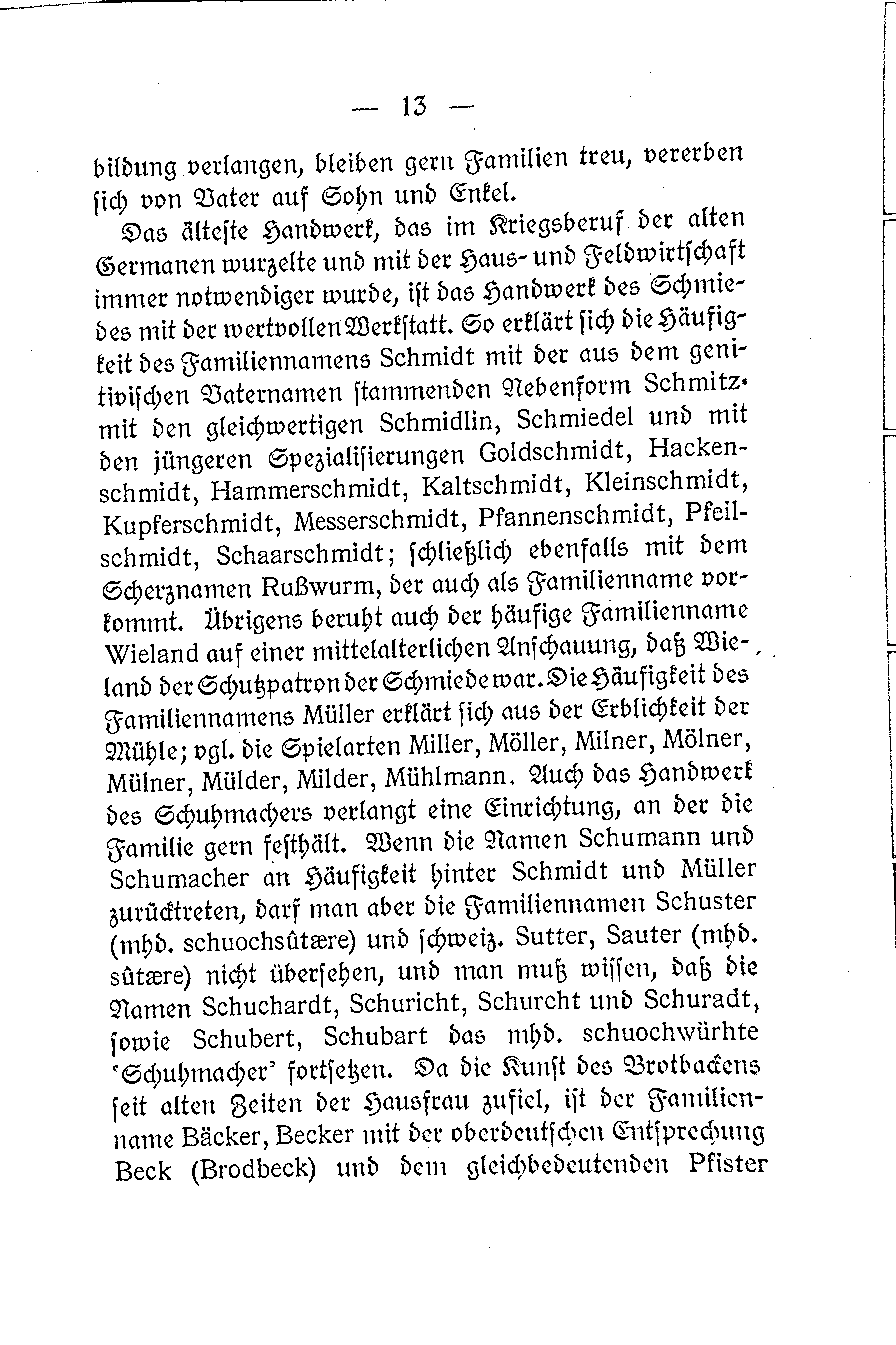 Das älteste Handwerk, das im Kriegsberuf der alten Germanen wurzelte und mit der Haus- und Feldwirtschaft immer notwendiger wurde, ist das Handwerk des Schmiedes mit der wertvollen Werkstatt. So erklärt sich die Häufigkeit des Familiennamens Schmidt mit der aus dem genitivischen Vaternamen stammenden Nebenform Schmitz mit den gleichwertigen Schmidlin, Schmiedel und mit den jüngeren Spezialisierungen Goldschmidt, Hackenschmidt, Hammerschmidt, Kaltschmidt, Kleinschmidt, Kupferschmidt, Messerschmidt, Pfannenschmidt, Pfeilschmidt, Schaarschmidt; schließlich ebenfalls mit dem Scherznamen Rußwurm, der auch als Familiennamen vorkommt. Übrigens beruht auch der häufige Familienname Wieland auf einer mittelalterlichen Anschauung, daß Wieland der Schutzpatron der Schmiede war. Die Häufigkeit des Familiennamens Müller erklärt sich aus der Erblichkeit der Mühle; vgl. die Spielarten Miller, Möller, Milner, Mölner, Mülner, Mülder, Milder, Mühlmann. Auch das Handwerk des Schuhmachers verlangt eine Einrichtung, an der die Familie gern festhält. Wenn die Namen Schumann und Schumacher an Häufigkeit hinter Schmidt und Müller zurücktreten, darf man aber die Familiennamen Schuster (mhd. schuochsûtære) und schweiz. Sutter, Sauter (mhd. sûtære) nicht übersehen, und man muß wissen, daß die Namen Schuchardt, Schuricht, Schurcht und Schuradt, sowie Schubert, Schubart das mhd. schuochwürthe ‘Schuhmacher’ fortsetzen. Da die Kunst des Brotbackens seit alten Zeiten der Hausfrau zufiel, ist der Familienname Bäcker, Becker mit der oberdeutschen Entsprechung Beck (Brodbeck) und dem gleichbedeutenden Pfister