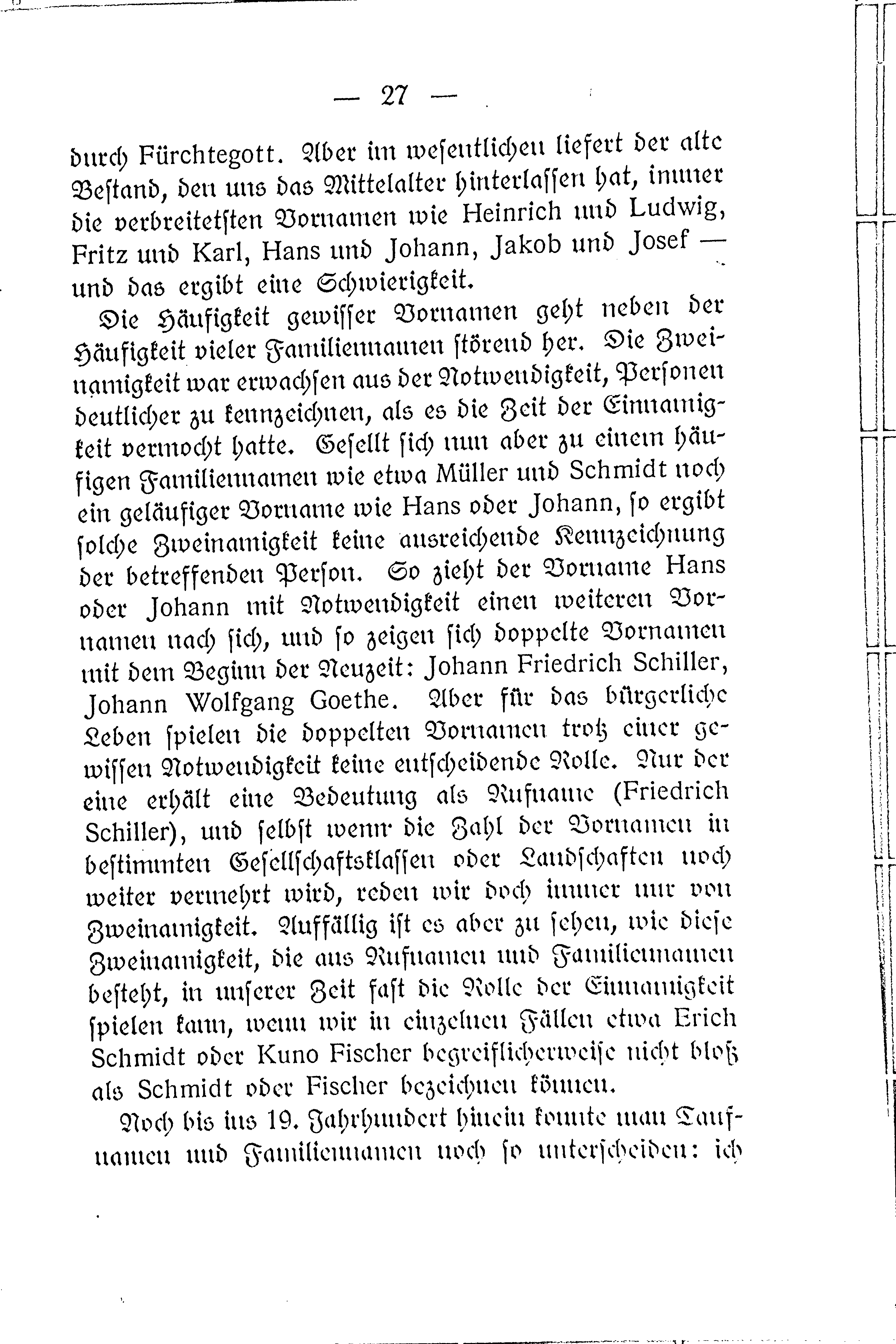 Die Häufigkeit gewisser Vornamen geht neben der Häufigkeit vieler Familiennamen störend her. Die Zweinamigkeit war erwachsen aus der Notwendigkeit, Personen deutlicher zu kennzeichnen, als es die Zeit der Einnamigkeit vermocht hatte. Gesellt sich nun aber zu einem häufigen Familiennamen wie etwa Müller und Schmidt noch ein geläufiger Vorname wie Hans oder Johann, so ergibt solche Zweinamigkeit keine ausreichende Kennzeichnung der betreffenden Person. So zieht der Vorname Hans oder Johann mit Notwendigkeit einen weiteren Vornamen nach sich, und so zeigen sich doppelte Vornamen mit dem Beginn der Neuzeit: Johann Friedrich Schiller, Johann Wolfgang Goethe. Aber für das bürgerliche Leben spielen die doppelten Vornamen trotz einer gewissen Notwendigkeit keine entscheidende Rolle. Nur der eine erhält eine Bedeutung als Rufnamen (Friedrich Schiller), und selbst wenn die Zahl der Vornamen in bestimmten Gesellschaftsklassen oder Landschaften noch weiter vermehrt wird, reden wir doch immer nur von Zweinamigkeit. Auffällig ist es aber zu sehen, wie diese Zweinamigkeit, die aus Rufnamen und Familiennamen besteht, in unserer Zeit fast die Rolle der Einnamigkeit spielen kann, wenn wir in einzelnen Fällen etwa Erich Schmidt oder Kuno Fischer begreiflicherweise nicht bloß als Schmidt oder Fischer bezeichnen können.
