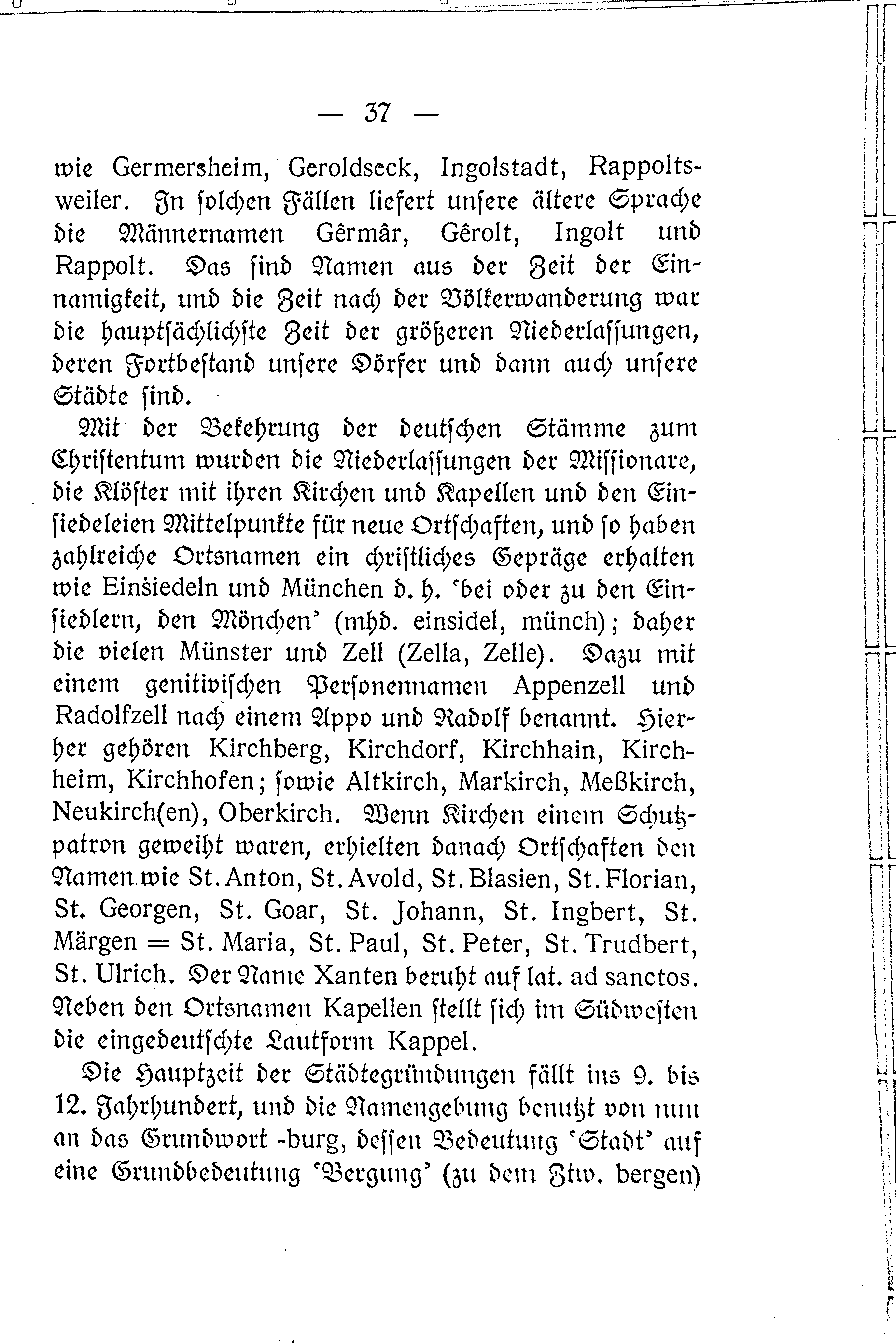 wie Germersheim, Geroldseck, Ingolstadt, Rappoltsweiler. In solchen Fällen liefert unsere ältere Sprache die Männernamen Gêrmâr, Gêrolt, Ingolt und Rappolt. Das sind Namen aus der Zeit der Einnamigkeit, und die Zeit nach der Völkerwanderung war die hauptsächlichste Zeit der größeren Niederlassungen, deren Fortbestand unsere Dörfer und dann auch unsere Städte sind.