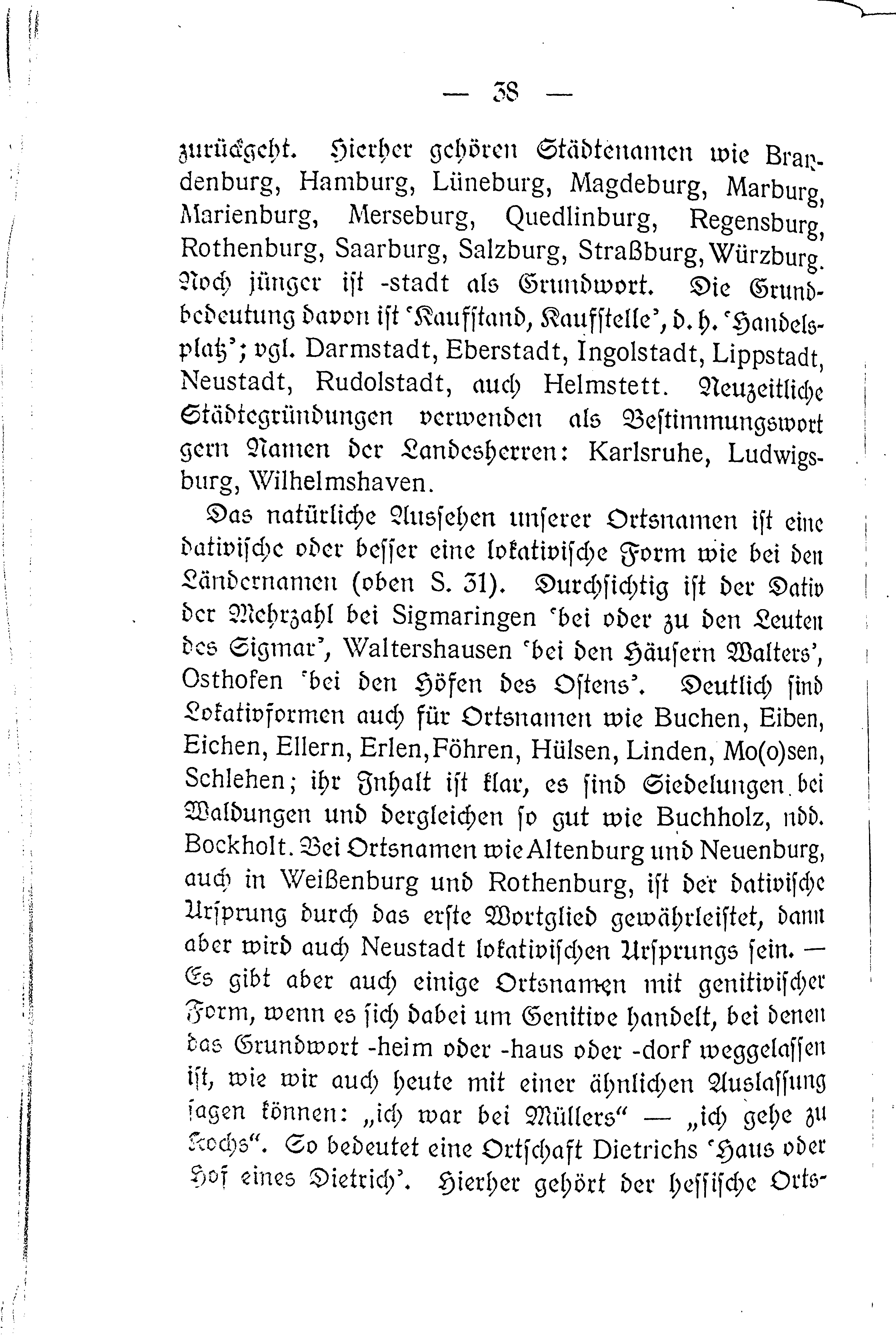 Das natürliche Aussehen unserer Ortsnamen ist eine dativische oder besser eine lokativische Form wie bei den Ländernamen (oben S. 31). Durchsichtig ist der Dativ der Mehrzahl bei Sigmaringen ‘bei oder zu den Leuten des Sigmar’, Waltershausen ‘bei den Häusern Walters’, Osthofen ‘bei den Höfen des Ostens’. Deutlich sind Lokativformen auch für Ortsnamen wie Buchen, Eiben, Eichen, Ellern, Erlen, Föhren, Hülsen, Linden, Mo(o)sen, Schlehen; ihr Inhalt ist klar, es sind Siedelungen bei Waldungen und dergleichen so gut wie Buchholz, ndd. Bockholt. Bei Ortsnamen wie Altenburg und Neuenburg, auch in Weißenburg und Rothenburg, ist der dativische Ursprung durch das erste Wortglied gewährleistet, dann aber wird auch Neustadt lokativischen Ursprungs sein. — Es gibt aber auch einige Ortsnamen mit genitivischer Form, wenn es sich dabei um Genitive handelt, bei denen das Grundwort -heim oder -haus oder -dorf weggelassen ist, wie wir auch heute mit einer ähnlichen Auslassung sagen können: „ich war bei Müllers“ — „ich gehe zu Kochs“. So bedeutet eine Ortschaft Dietrichs ‘Haus oder Hof eines Dietrich’. Hierher gehört der hessische Ortsname