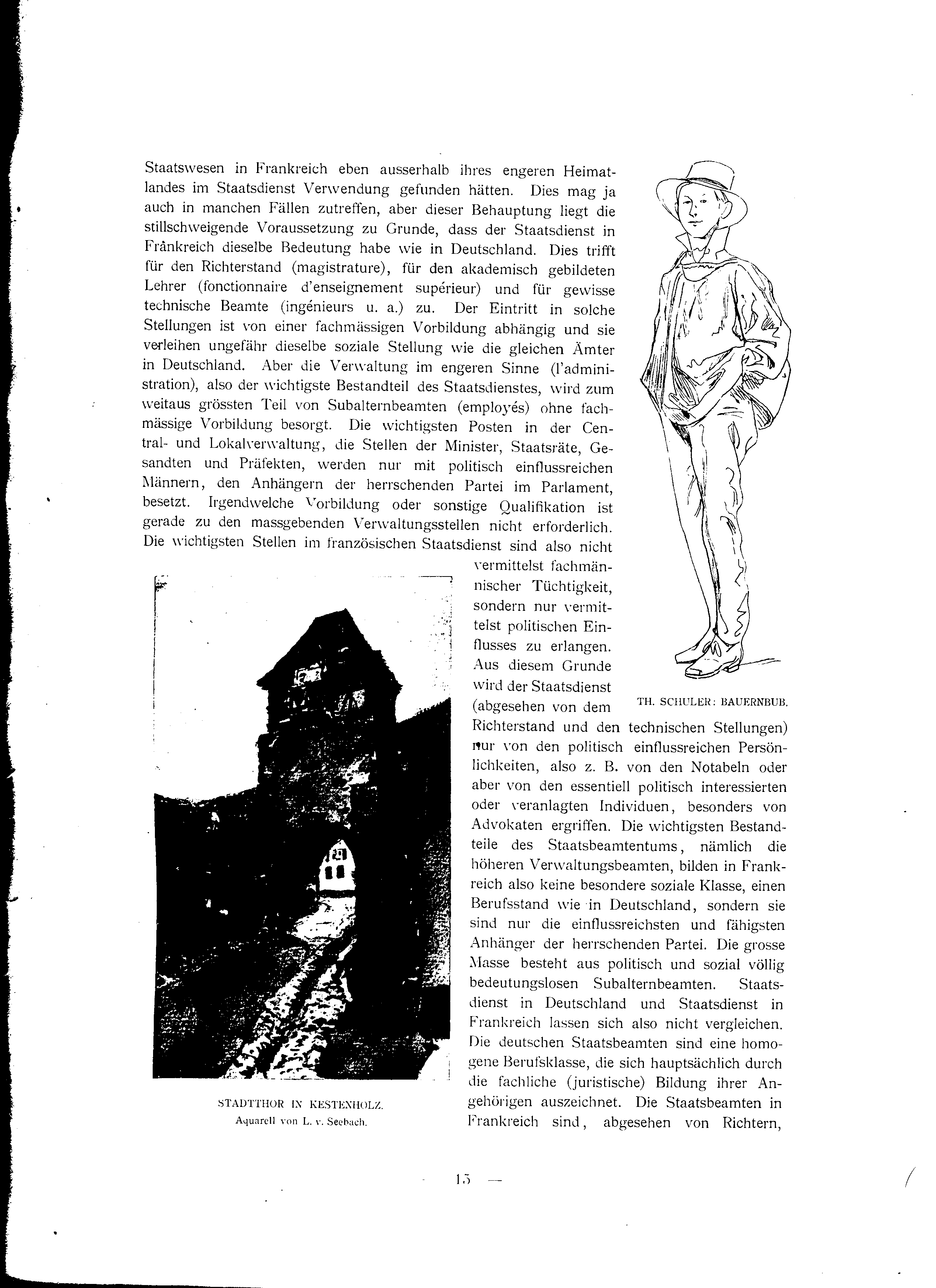Staatswesen in Frankreich eben ausserhalb ihres engeren Heimatlandes im Staatsdienst Verwendung gefunden hätten. Dies mag ja auch in manchen Fällen zutreffen, aber dieser Behauptung liegt die stillschweigende Voraussetzung zu Grunde, dass der Staatsdienst in Frankreich dieselbe Bedeutung habe wie in Deutschland. Dies trifft für den Richterstand (magistrature), für den akademisch gebildeten Lehrer (fonctionnaire d'enseignement supérieur) und für gewisse technische Beamte (ingénieurs u. a.) zu. Der Eintritt in solche Stellungen ist von einer fachmässigen Vorbildung abhängig und sie verleihen ungefähr dieselbe soziale Stellung wie die gleichen Ämter in Deutschland. Aber die Verwaltung im engeren Sinne (l'administration), also der wichtigste Bestandteil des Staatsdienstes, wird zum weitaus grössten Teil von Subalternbeamten (employés) ohne fachmässige Vorbildung besorgt. Die wichtigsten Posten in der Central- und Lokalverwaltung, die Stellen der Minister, Staatsräte, Gesandten und Präfekten, werden nur mit politisch einflussreichen Männern, den Anhängern der herrschenden Partei im Parlament, besetzt. Irgendwelche Vorbildung oder sonstige Qualifikation ist gerade zu den massgebenden Verwaltungsstellen nicht erforderlich. Die wichtigsten Stellen im französischen Staatsdienst sind also nicht vermittelst fachmännischer Tüchtigkeit, sondern nur vermittelst politischen Einflusses zu erlangen. Aus diesem Grunde wird der Staatsdienst (abgesehen von dem Richterstand und den technischen Stellungen) nur von den politisch einflussreichen Persönlichkeiten, also z. B. von den Notabeln oder aber von den essentiell politisch interessierten oder veranlagten Individuen, besonders von Advokaten ergriffen. Die wichtigsten Bestandteile des Staatsbeamtentums, nämlich die höheren Verwaltungsbeamten, bilden in Frankreich also keine besondere soziale Klasse, einen Berufsstand wie in Deutschland, sondern sie sind nur die einflussreichsten und fähigsten Anhänger der herrschenden Partei. Die grosse Masse besteht aus politisch und sozial völlig bedeutungslosen Subalternbeamten. Staatsdienst in Deutschland und Staatsdienst in Frankreich lassen sich also nicht vergleichen. Die deutschen Staatsbeamten sind eine homogene Berufsklasse, die sich hauptsächlich durch die fachliche (juristische) Bildung ihrer Angehörigen auszeichnet. Die Staatsbeamten in Frankreich sind, abgesehen von Richtern,