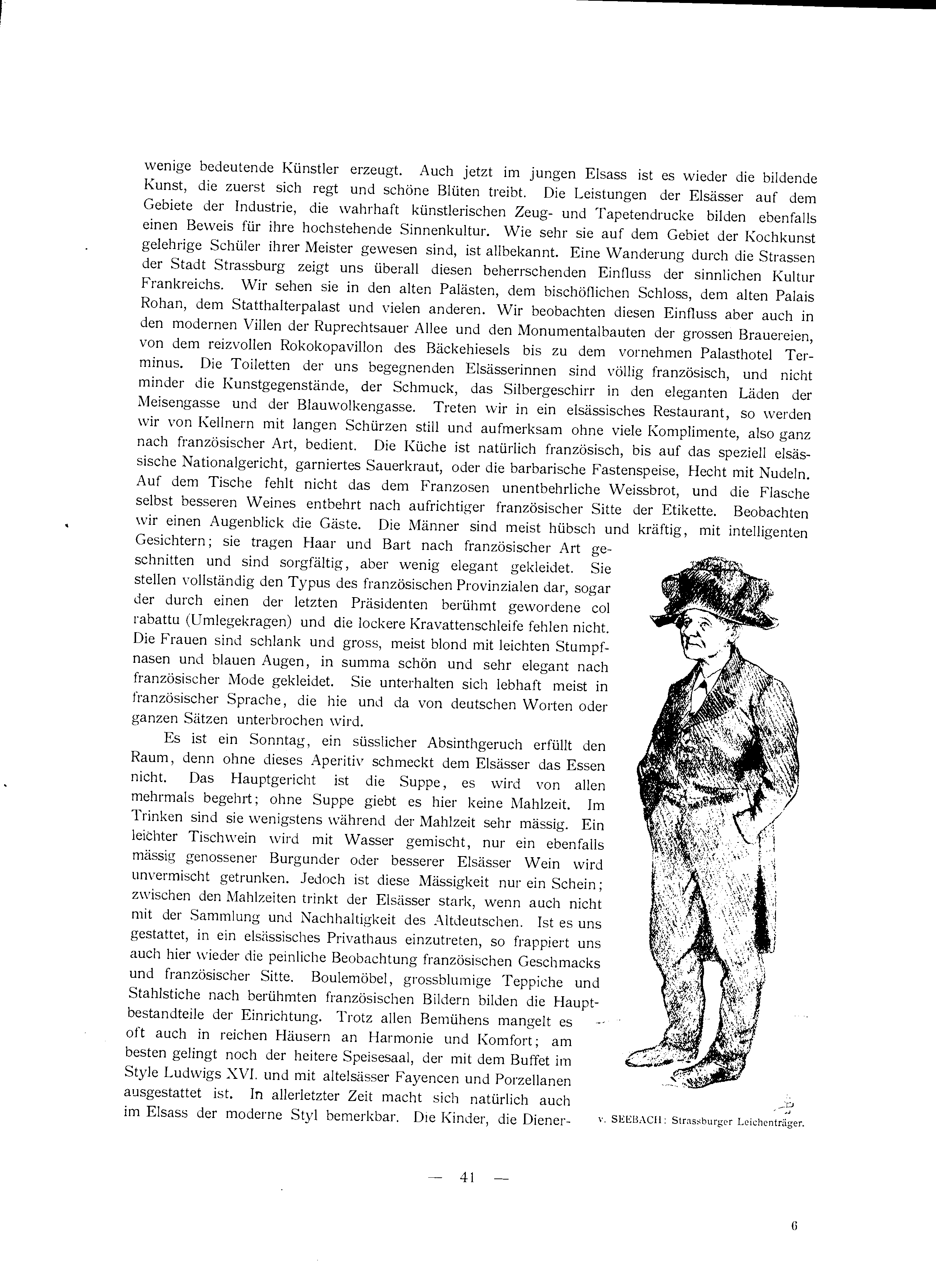 wenige bedeutende Künstler erzeugt. Auch jetzt im jungen Elsass ist es wieder die bildende Kunst, die zuerst sich regt und schöne Blüten treibt. Die Leistungen der Elsässer auf dem Gebiete der Industrie, die wahrhaft künstlerischen Zeug- und Tapetendrucke bilden ebenfalls einen Beweis für ihre hochstehende Sinnenkultur. Wie sehr sie auf dem Gebiet der Kochkunst gelehrige Schüler ihrer Meister gewesen sind, ist allbekannt. Eine Wanderung durch die Strassen der Stadt Strassburg zeigt uns überall diesen beherrschenden Einfluss der sinnlichen Kultur Frankreichs. Wir sehen sie in den alten Palästen, dem bischöflichen Schloss, dem alten Palais Rohan, dem Statthalterpalast und vielen anderen. Wir beobachten diesen Einfluss aber auch in den modernen Villen der Ruprechtsauer Allee und den Monumentalbauten der grossen Brauereien, von dem reizvollen Rokokopavillon des Bäckehiesels bis zu dem vornehmen Palasthotel Terminus. Die Toiletten der uns begegnenden Elsässerinnen sind völlig französisch, und nicht minder die Kunstgegenstände, der Schmuck, das Silbergeschirr in den eleganten Läden der Meisengasse und der Blauwolkengasse. Treten wir in ein elsässisches Restaurant, so werden wir von Kellnern mit langen Schürzen still und aufmerksam ohne viele Komplimente, also ganz nach französischer Art, bedient. Die Küche ist natürlich französisch, bis auf das speziell elsässische Nationalgericht, garniertes Sauerkraut, oder die barbarische Fastenspeise, Hecht mit Nudeln. Auf dem Tische fehlt nicht das dem Franzosen unentbehrliche Weissbrot, und die Flasche selbst besseren Weines entbehrt nach aufrichtiger französischer Sitte der Etikette. Beobachten wir einen Augenblick die Gäste. Die Männer sind meist hübsch und kräftig, mit intelligenten Gesichtern; sie tragen Haar und Bart nach französischer Art geschnitten und sind sorgfältig, aber wenig elegant gekleidet. Sie stellen vollständig den Typus des französischen Provinzialen dar, sogar der durch einen der letzten Präsidenten berühmt gewordene col rabattu (Umlegekragen) und die lockere Kravattenschleife fehlen nicht. Die Frauen sind schlank und gross, meist blond mit leichten Stumpfnasen und blauen Augen, in summa schön und sehr elegant nach französischer Mode gekleidet. Sie unterhalten sich lebhaft meist in französischer Sprache, die hie und da von deutschen Worten oder ganzen Sätzen unterbrochen wird.