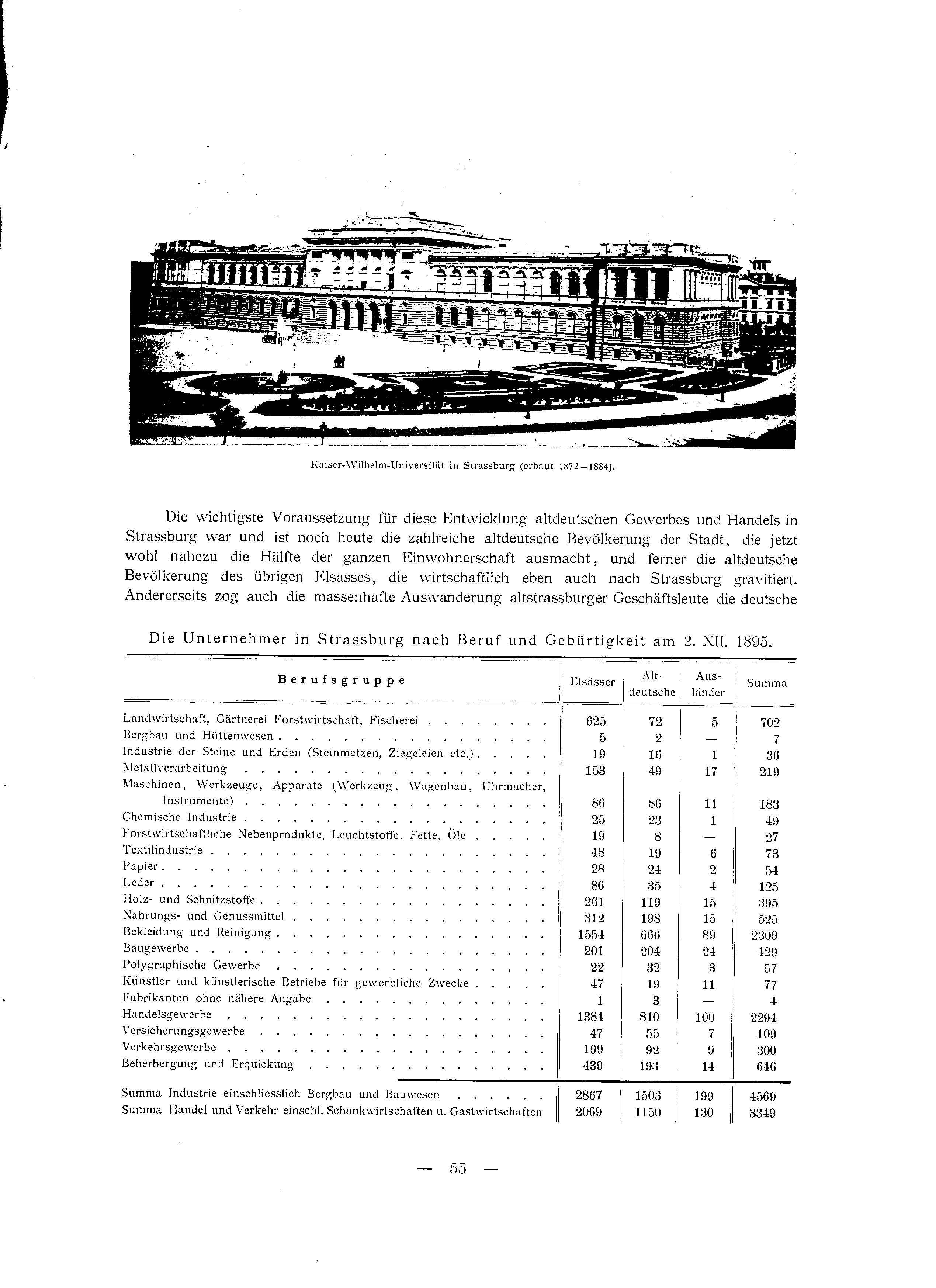 Die wichtigste Voraussetzung für diese Entwicklung altdeutschen Gewerbes und Handels in Strassburg war und ist noch heute die zahlreiche altdeutsche Bevölkerung der Stadt, die jetzt wohl nahezu die Hälfte der ganzen Einwohnerschaft ausmacht, und ferner die altdeutsche Bevölkerung des übrigen Elsasses, die wirtschaftlich eben auch nach Strassburg gravitiert. Andererseits zog auch die massenhafte Auswanderung altstrassburger Geschäftsleute die deutsche