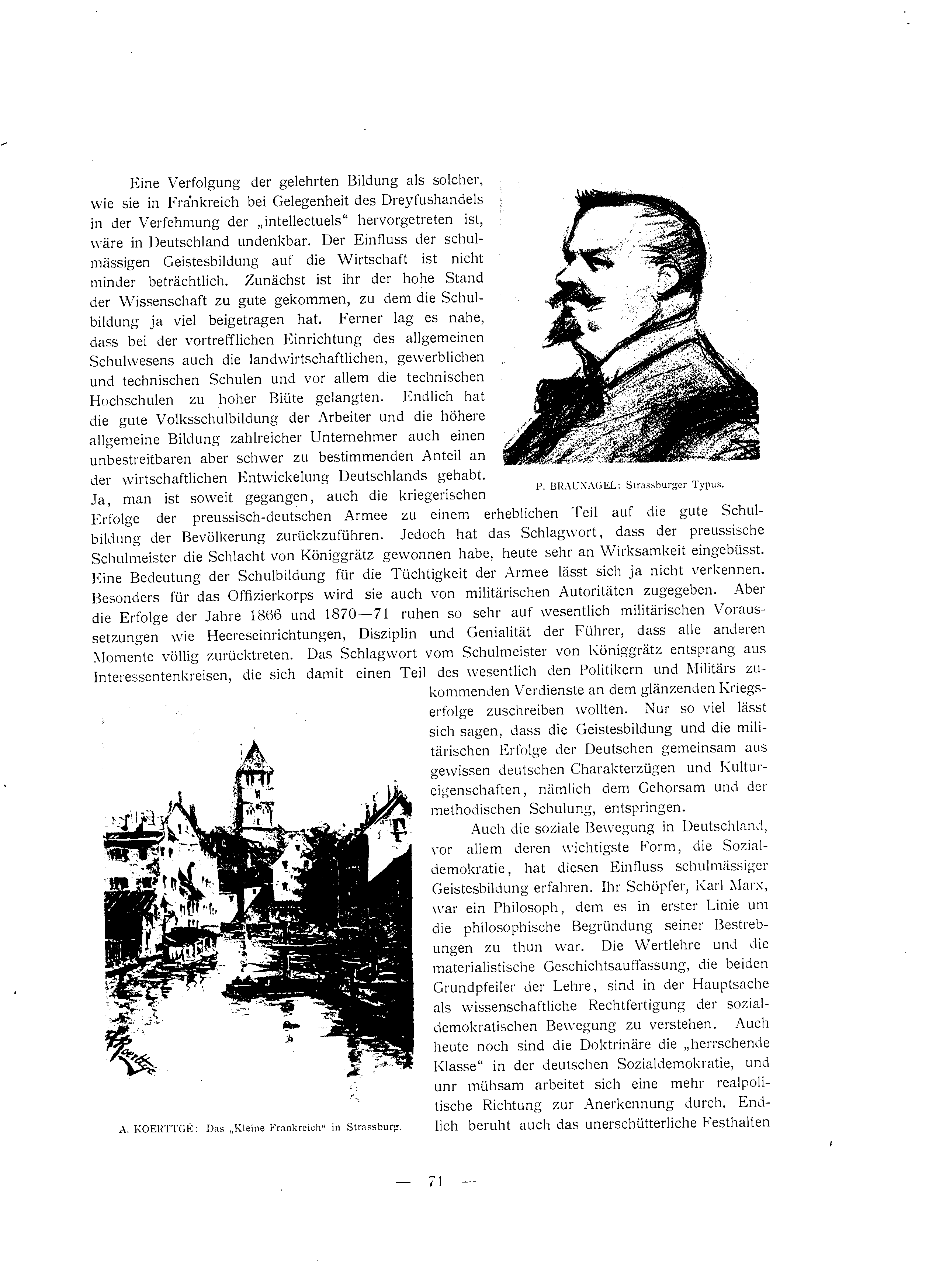 Eine Verfolgung der gelehrten Bildung als solcher, wie sie in Frankreich bei Gelegenheit des Dreyfushandels in der Verfehmung der „intellectuels" hervorgetreten ist, wäre in Deutschland undenkbar. Der Einfluss der schulmässigen Geistesbildung auf die Wirtschaft ist nicht minder beträchtlich. Zunächst ist ihr der hohe Stand der Wissenschaft zu gute gekommen, zu dem die Schulbildung ja viel beigetragen hat. Ferner lag es nahe, dass bei der vortrefflichen Einrichtung des allgemeinen Schulwesens auch die landwirtschaftlichen, gewerblichen und technischen Schulen und vor allem die technischen Hochschulen zu hoher Blüte gelangten. Endlich hat die gute Volksschulbildung der Arbeiter und die höhere allgemeine Bildung zahlreicher Unternehmer auch einen unbestreitbaren aber schwer zu bestimmenden Anteil an der wirtschaftlichen Entwickelung Deutschlands gehabt. Ja, man ist soweit gegangen, auch die kriegerischen Erfolge der preussisch-deutschen Armee zu einem erheblichen Teil auf die gute Schulbildung der Bevölkerung zurückzuführen. Jedoch hat das Schlagwort, dass der preussische Schulmeister die Schlacht von Königgrätz gewonnen habe, heute sehr an Wirksamkeit eingebüsst. Eine Bedeutung der Schulbildung für die Tüchtigkeit der Armee lässt sich ja nicht verkennen. Besonders für das Offizierkorps wird sie auch von militärischen Autoritäten zugegeben. Aber die Erfolge der Jahre 1866 und 1870—71 ruhen so sehr auf wesentlich militärischen Voraussetzungen wie Heereseinrichtungen, Disziplin und Genialität der Führer, dass alle anderen Momente völlig zurücktreten. Das Schlagwort vom Schulmeister von Königgrätz entsprang aus Interessentenkreisen, die sich damit einen Teil des wesentlich den Politikern und Militärs zukommenden Verdienste an dem glänzenden Kriegserfolge zuschreiben wollten. Nur so viel lässt sich sagen, dass die Geistesbildung und die militärischen Erfolge der Deutschen gemeinsam aus gewissen deutschen Charakterzügen und Kultureigenschaften, nämlich dem Gehorsam und der methodischen Schulung, entspringen.