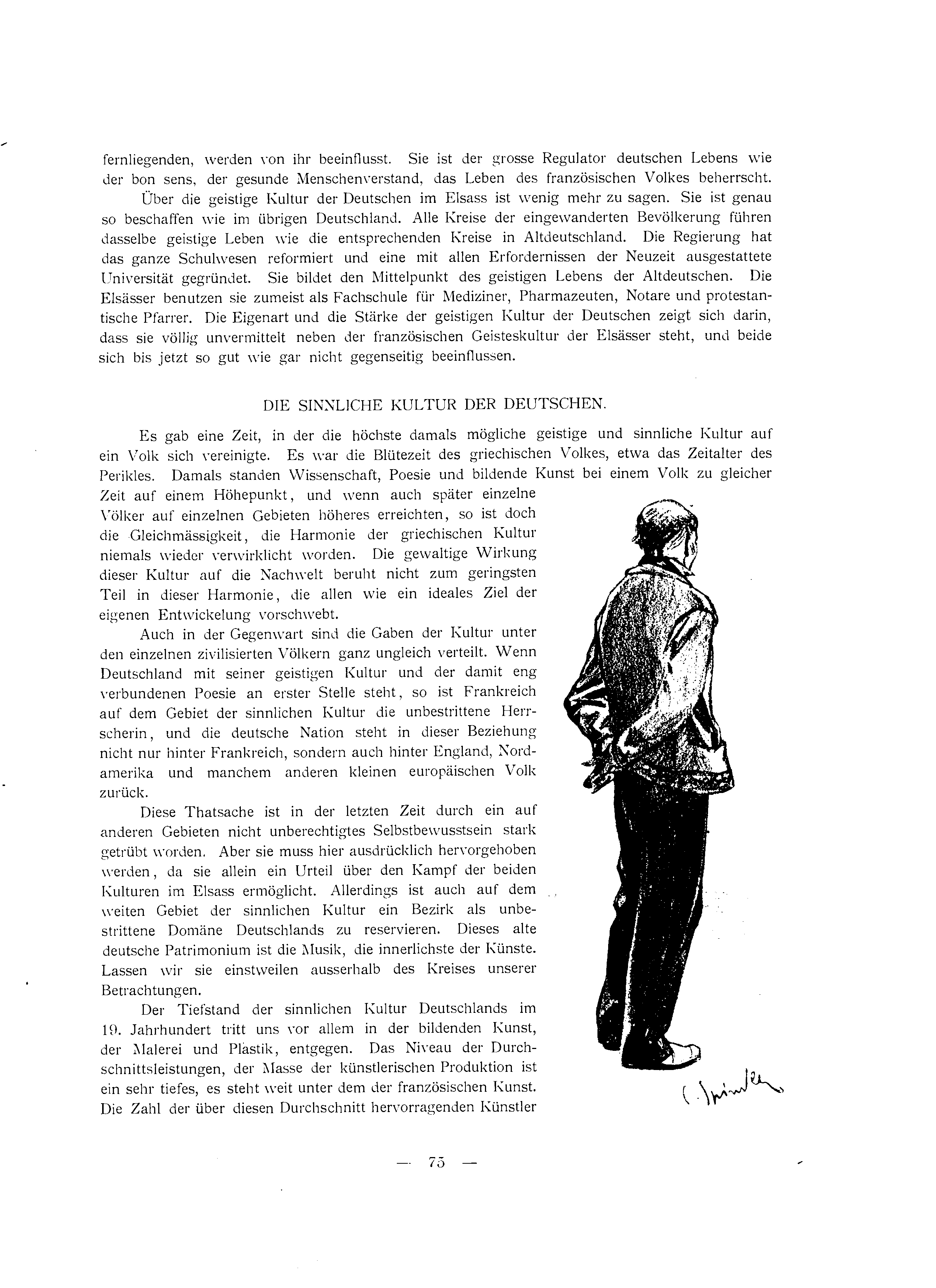 Diese Thatsache ist in der letzten Zeit durch ein auf anderen Gebieten nicht unberechtigtes Selbstbewusstsein stark getrübt worden. Aber sie muss hier ausdrücklich hervorgehoben werden, da sie allein ein Urteil über den Kampf der beiden Kulturen im Elsass ermöglicht. Allerdings ist auch auf dem weiten Gebiet der sinnlichen Kultur ein Bezirk als unbestrittene Domäne Deutschlands zu reservieren. Dieses alte deutsche Patrimonium ist die Musik, die innerlichste der Künste. Lassen wir sie einstweilen ausserhalb des Kreises unserer Betrachtungen.