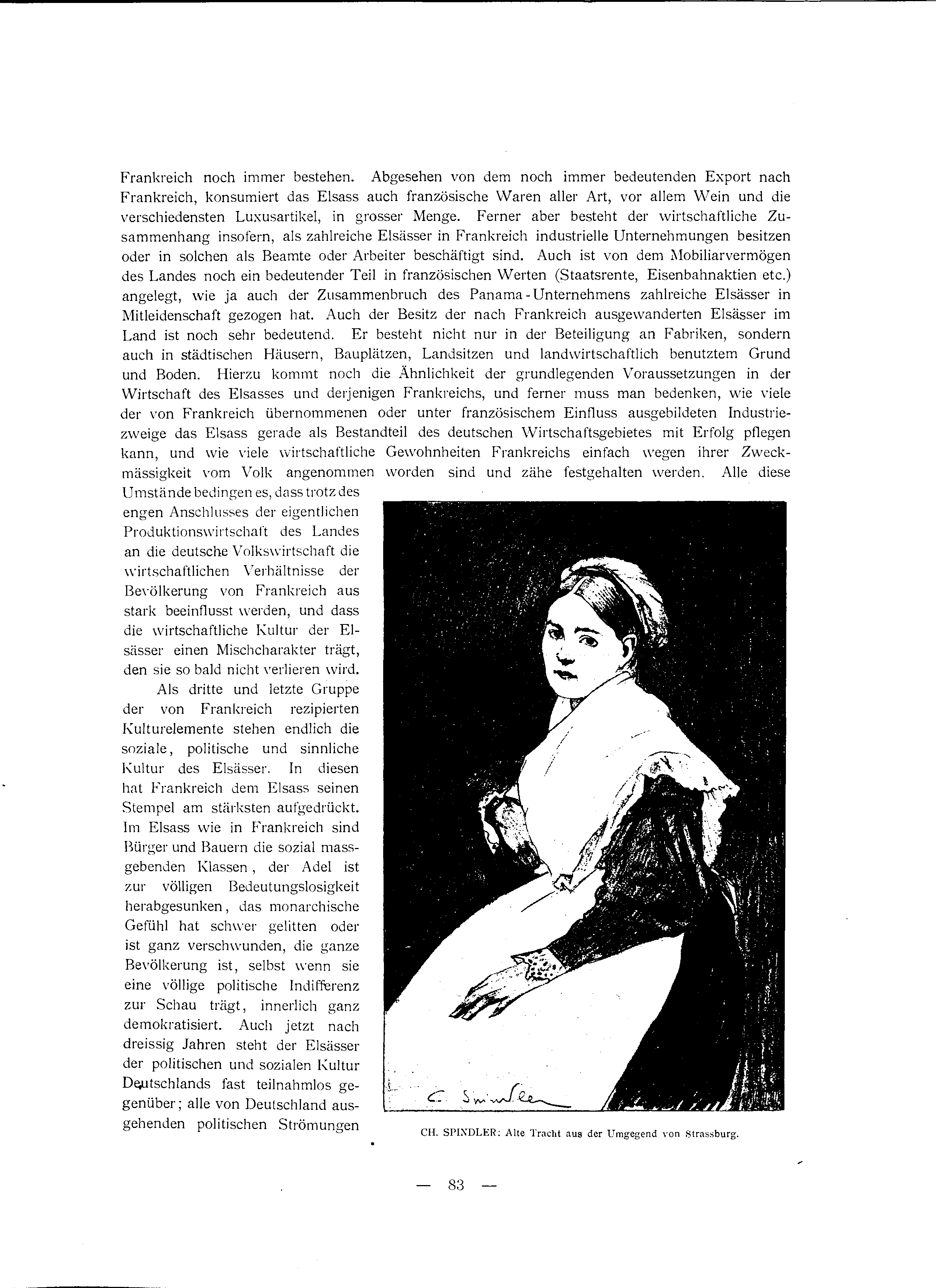 Frankreich noch immer bestehen. Abgesehen von dem noch immer bedeutenden Export nach Frankreich, konsumiert das Elsass auch französische Waren aller Art, vor allem Wein und die verschiedensten Luxusartikel, in grosser Menge. Ferner aber besteht der wirtschaftliche Zusammenhang insofern, als zahlreiche Elsässer in Frankreich industrielle Unternehmungen besitzen oder in solchen als Beamte oder Arbeiter beschäftigt sind. Auch ist von dem Mobiliarvermögen des Landes noch ein bedeutender Teil in französischen Werten (Staatsrente, Eisenbahnaktien etc.) angelegt, wie ja auch der Zusammenbruch des Panama-Unternehmens zahlreiche Elsässer in Mitleidenschaft gezogen hat. Auch der Besitz der nach Frankreich ausgewanderten Elsässer im Land ist noch sehr bedeutend. Er besteht nicht nur in der Beteiligung an Fabriken, sondern auch in städtischen Häusern, Bauplätzen, Landsitzen und landwirtschaftlich benutztem Grund und Boden. Hierzu kommt noch die Ähnlichkeit der grundlegenden Voraussetzungen in der Wirtschaft des Elsasses und derjenigen Frankreichs, und ferner muss man bedenken, wie viele der von Frankreich übernommenen oder unter französischem Einfluss ausgebildeten Industriezweige das Elsass gerade als Bestandteil des deutschen Wirtschaftsgebietes mit Erfolg pflegen kann, und wie viele wirtschaftliche Gewohnheiten Frankreichs einfach wegen ihrer Zweckmässigkeit vom Volk angenommen worden sind und zähe festgehalten werden. Alle diese Umstände bedingen es, dass trotz des engen Anschlusses der eigentlichen Produktionswirtschaft des Landes an die deutsche Volkswirtschaft die wirtschaftlichen Verhältnisse der Bevölkerung von Frankreich aus stark beeinflusst werden, und dass die wirtschaftliche Kultur der Elsässer einen Mischcharakter trägt, den sie so bald nicht verlieren wird.