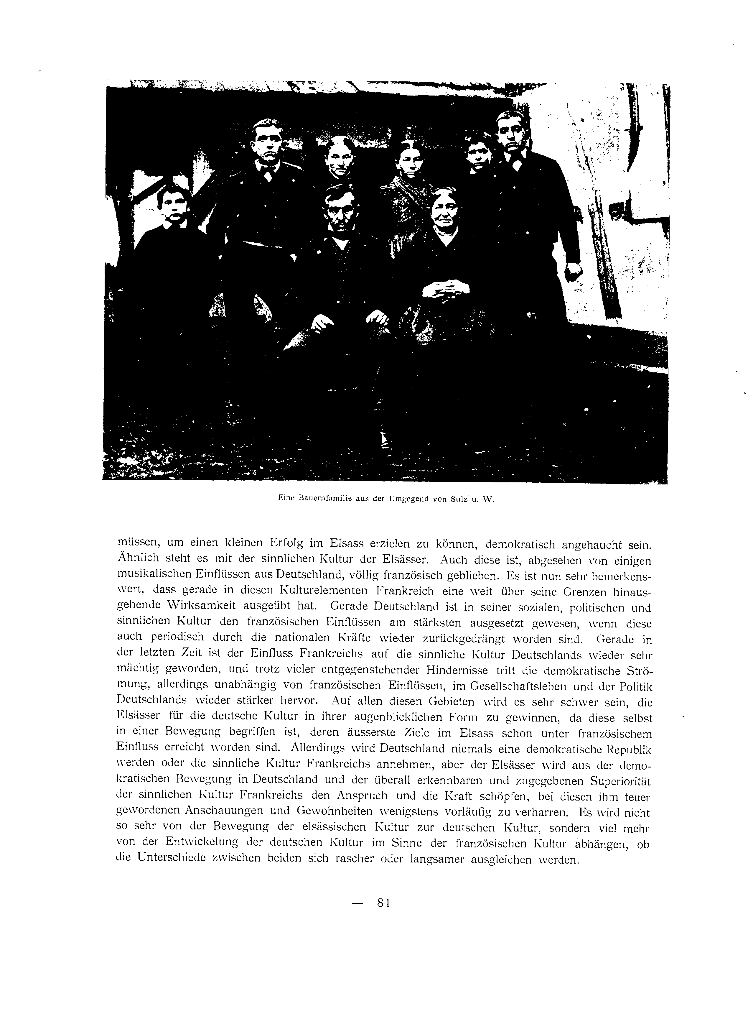 müssen, um einen kleinen Erfolg im Elsass erzielen zu können, demokratisch angehaucht sein. Ähnlich steht es mit der sinnlichen Kultur der Elsässer. Auch diese ist, abgesehen von einigen musikalischen Einflüssen aus Deutschland, völlig französisch geblieben. Es ist nun sehr bemerkenswert, dass gerade in diesen Kulturelementen Frankreich eine weit über seine Grenzen hinausgehende Wirksamkeit ausgeübt hat. Gerade Deutschland ist in seiner sozialen, politischen und sinnlichen Kultur den französischen Einflüssen am stärksten ausgesetzt gewesen, wenn diese auch periodisch durch die nationalen Kräfte wieder zurückgedrängt worden sind. Gerade in der letzten Zeit ist der Einfluss Frankreichs auf die sinnliche Kultur Deutschlands wieder sehr mächtig geworden, und trotz vieler entgegenstehender Hindernisse tritt die demokratische Strömung, allerdings unabhängig von französischen Einflüssen, im Gesellschaftsleben und der Politik Deutschlands wieder stärker hervor. Auf allen diesen Gebieten wird es sehr schwer sein, die Elsässer für die deutsche Kultur in ihrer augenblicklichen Form zu gewinnen, da diese selbst in einer Bewegung begriffen ist, deren äusserste Ziele im Elsass schon unter französischem Einfluss erreicht worden sind. Allerdings wird Deutschland niemals eine demokratische Republik werden oder die sinnliche Kultur Frankreichs annehmen, aber der Elsässer wird aus der demokratischen Bewegung in Deutschland und der überall erkennbaren und zugegebenen Superiorität der sinnlichen Kultur Frankreichs den Anspruch und die Kraft schöpfen, bei diesen ihm teuer gewordenen Anschauungen und Gewohnheiten wenigstens vorläufig zu verharren. Es wird nicht so sehr von der Bewegung der elsässischen Kultur zur deutschen Kultur, sondern viel mehr von der Entwickelung der deutschen Kultur im Sinne der französischen Kultur abhängen, ob die Unterschiede zwischen beiden sich rascher oder langsamer ausgleichen werden.